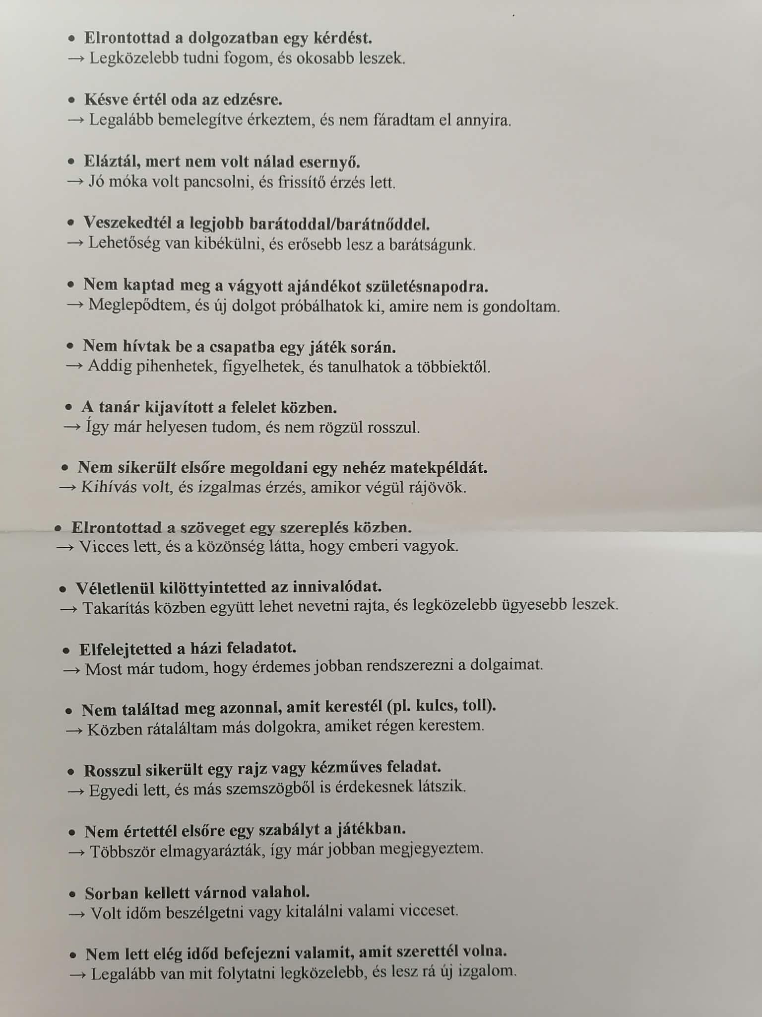 Ezt követően élménypedagógiai módszerrel dolgoztuk fel a témát: a diákok megkezdett, negatív tartalmú mondatokat fogalmaztak át optimista szemlélettel. A feladat során „optimista szemüveget” viseltek, amely szimbolikusan is segítette a pozitív nézőpont tudatosítását és megerősítését. A foglalkozás részeként meghallgattuk az optimizmushoz kapcsolódó dalt is, amely érzelmi ráerősítést adott a témára.