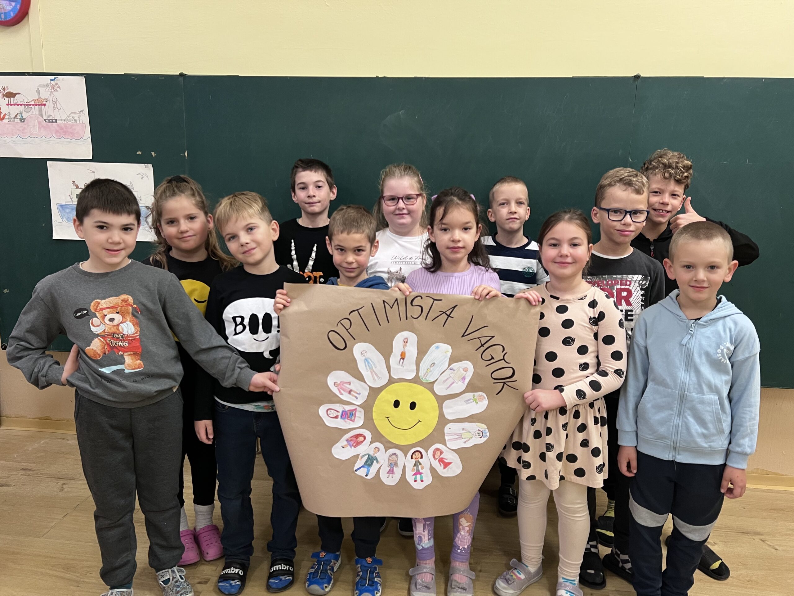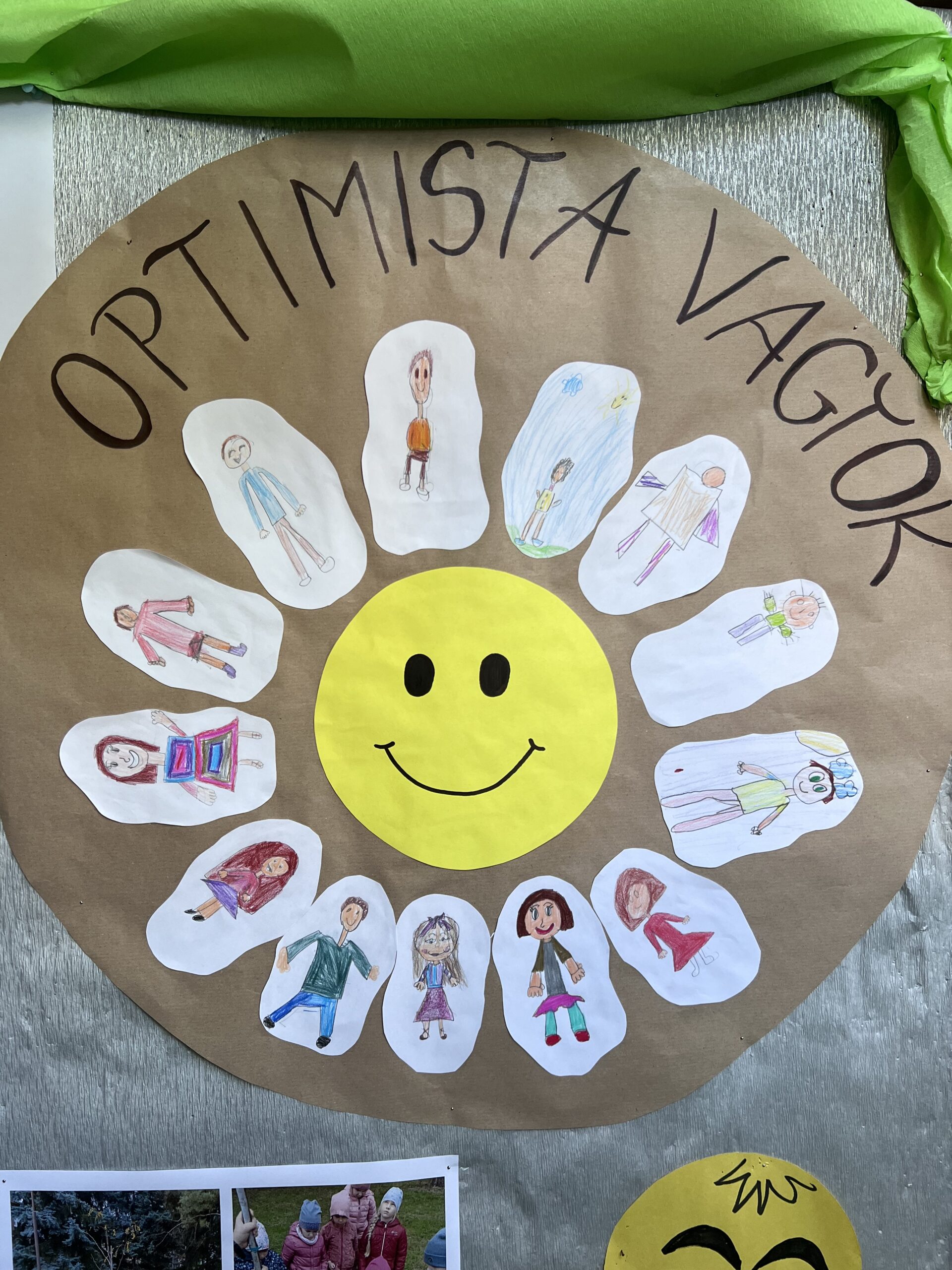 A csoporttal először az optimizmus és pesszimizmus különbségét fedeztük fel. Megértették, hogy az optimizmus olyan életszemlélet, amelyben a világ alapvetően jó hely, ahol az emberekben is sok jót találhatunk, és a dolgok végül rendeződnek. A gyerekek saját magukat is lerajzolták: mennyire tartják magukat optimistának. Így születtek meg a vidám rajzok magukról.