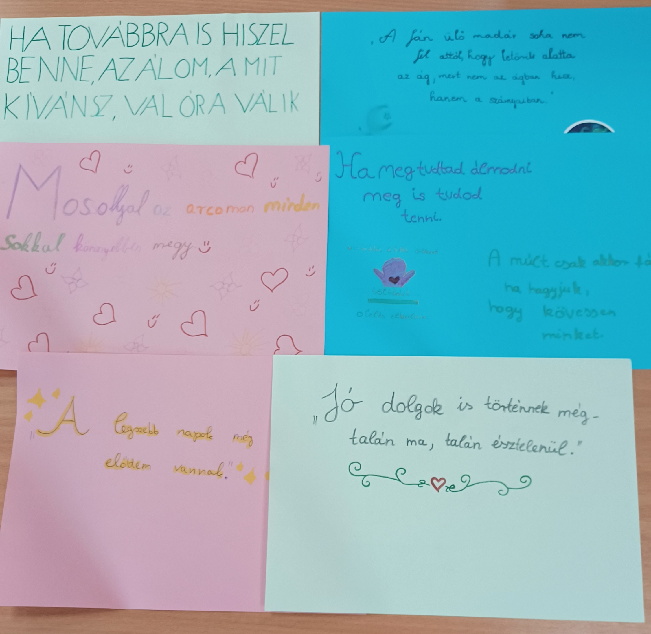 Megbeszéltük a beadandó feladatot, ez lett hf., amit a következő hétre el is készítettek a tanulók. Optimista idézeteket kerestek a tanulók, amit az osztály optimista képével tablóra ragasztottunk.