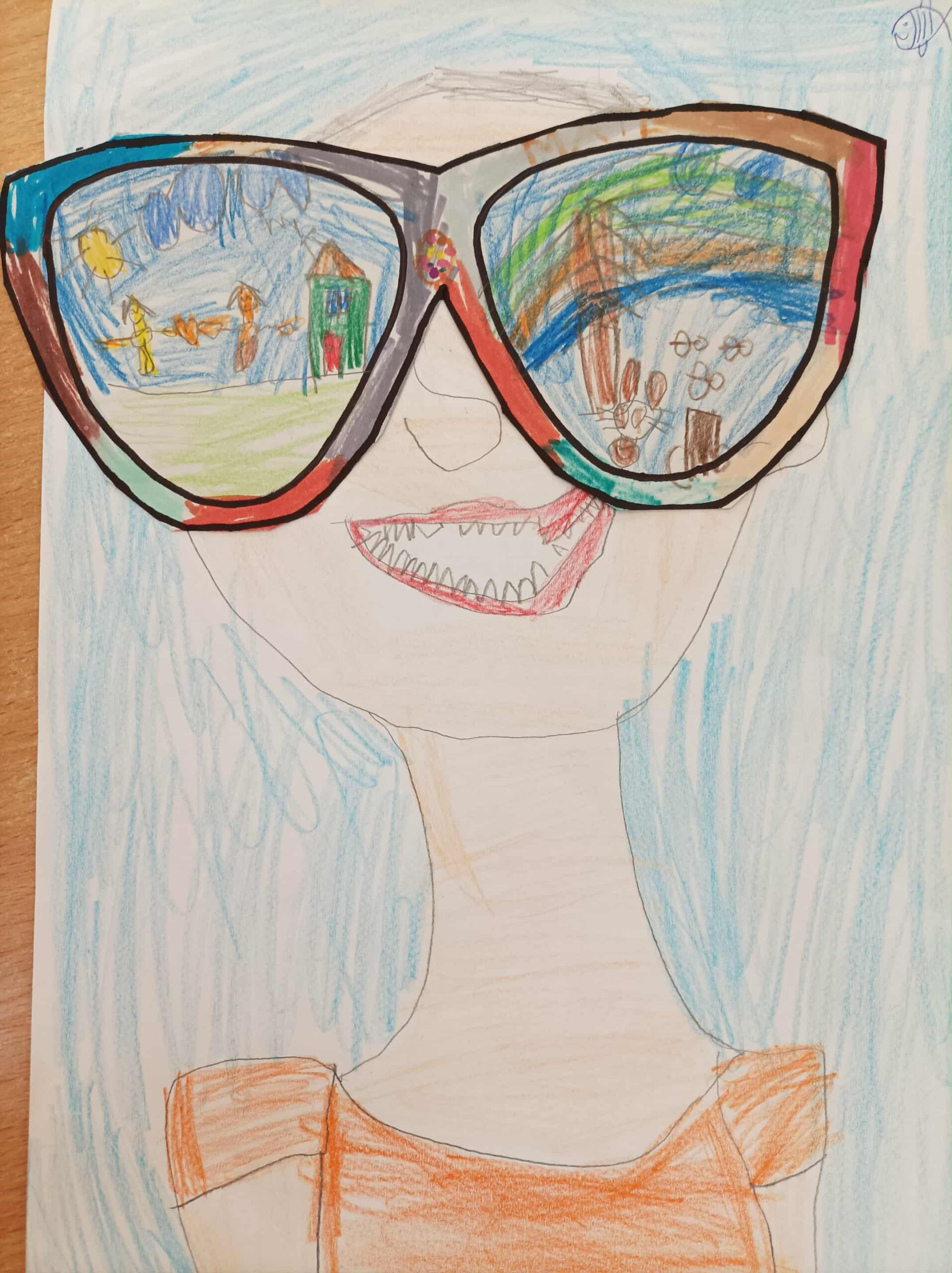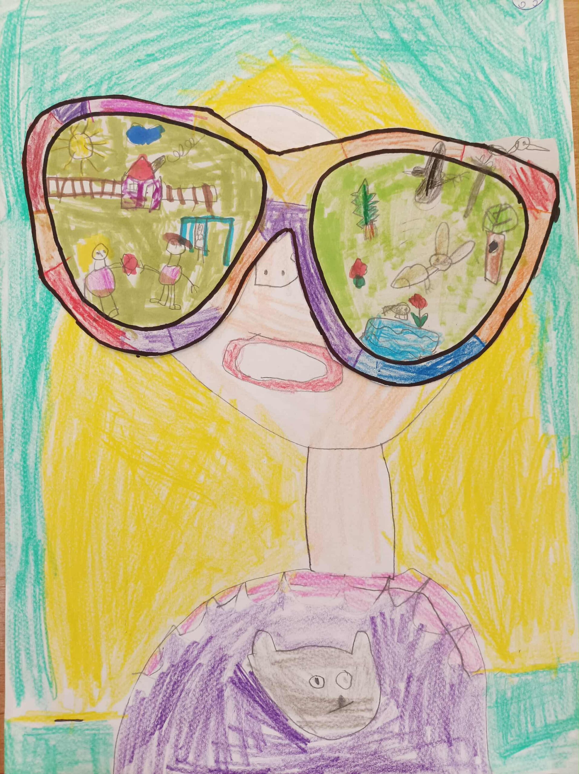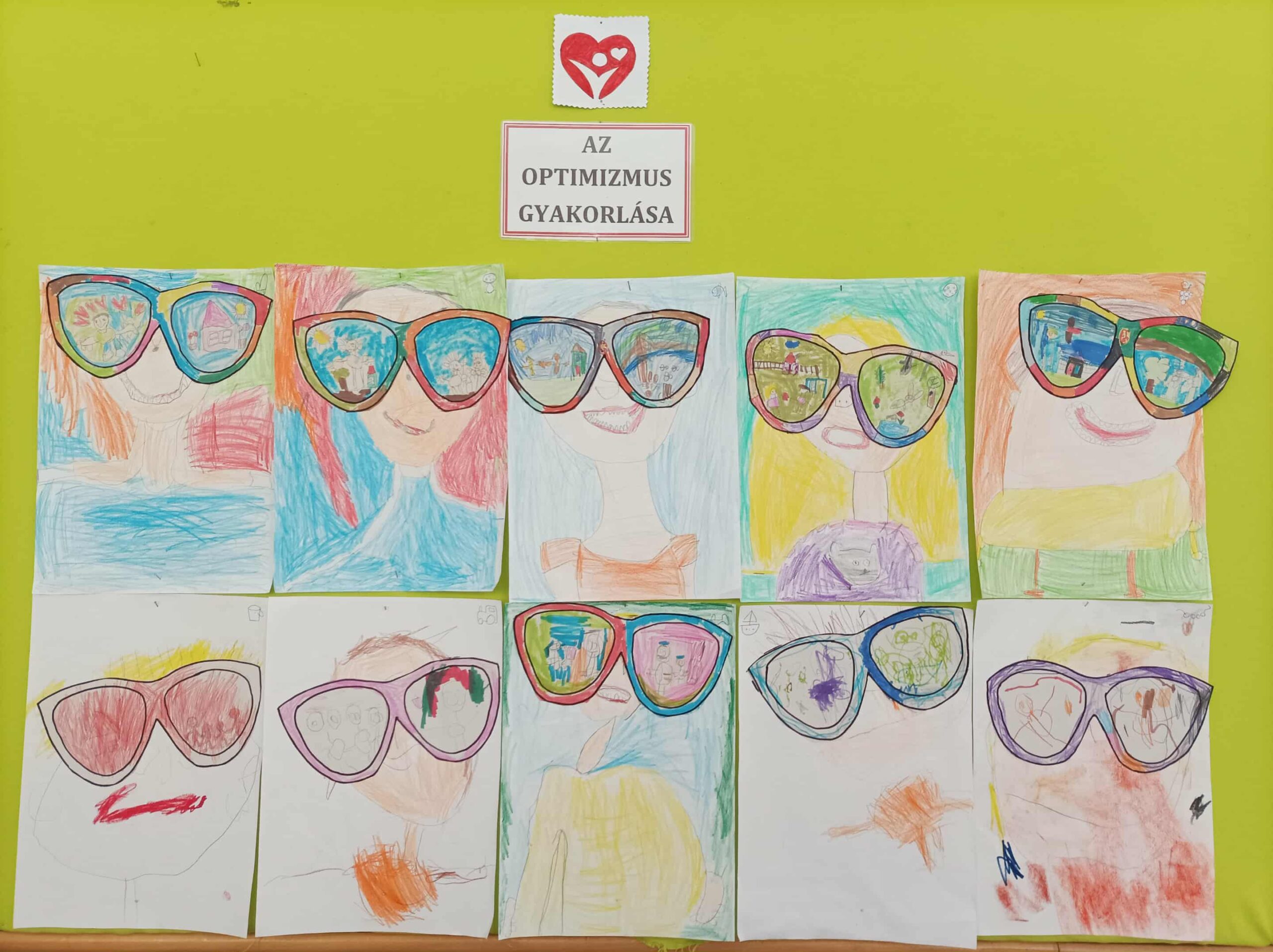 A gyerekek belenézhettek az optimista tükörbe, ahol elmondhatták magukról, hogy mi a szép, a jó bennük. Ezután vegyes technikával elkészítették arcképüket és saját optimista szemüvegüket, amelybe az élet szép, jó dolgait rajzolták bele. A közös alkotásokat kiraktuk a folyosóra, megbeszéltük, értékeltük egymás munkáját. A hónap zenéjére örömmel táncoltunk, énekeltünk.