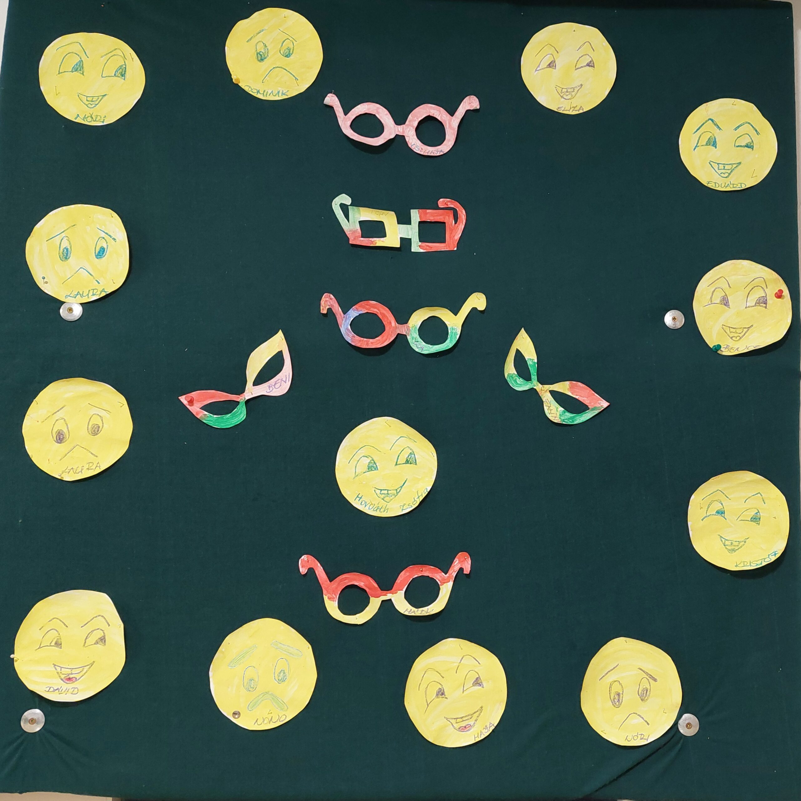 Közös relaxációval indítottuk a témát, mi voltunk a napocskák, ktártuk karunkat és beengedtük a szeretetet, a kellemes érzéseket, a boldogságot, hogy együtt vagyunk. Nagyon hatásos volt, a szülőkről nehezen leváló kicsiknek, mert lelküket megnyugtatta, hogy együtt játszva, énekelve, minden könnyebben átvészelhető, nincsenek „elhagyatva egyedül”. Az optimizmus fogalmát közös beszélgetéssel próbáltuk körüljárni, amit Tódi törpe történetének bemutatásával tettünk teljessé. A szeretet, barátság már most fontos ovisainknak, hiányolják egymást ha betegek. Az akadályok leküzdésében a felnőtteken kívül kis barátaikra is számítanak. A mese feldolgozása után elkészítettük a „varázsszemüvegeket” és az optimista és pesszimista jelképeinket. A végén mindenki kiválaszthatta,melyik illik az aktuális lelkiállapotához.