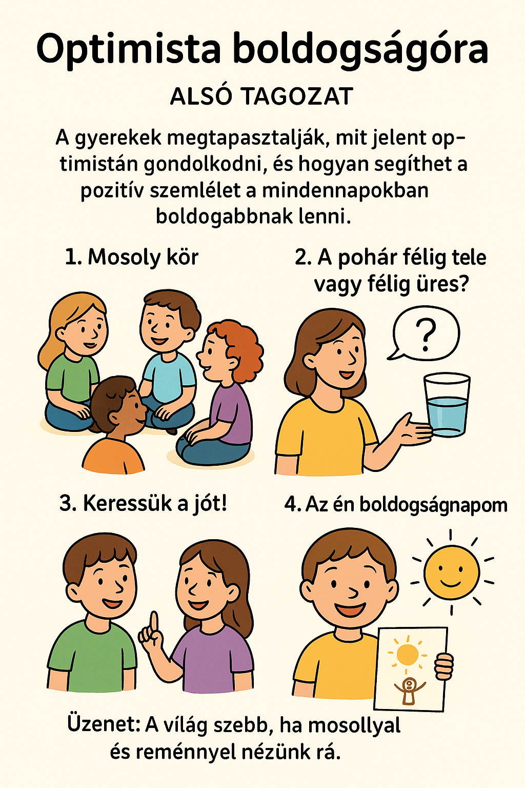 A gyerekek nagyon jól érezték magukat az órán, hiszen sok játékos feladat és vidám beszélgetés segítette őket abban, hogy megértsék: az optimizmus tanulható, és minden helyzetben érdemes a jó oldalát keresni a dolgoknak.