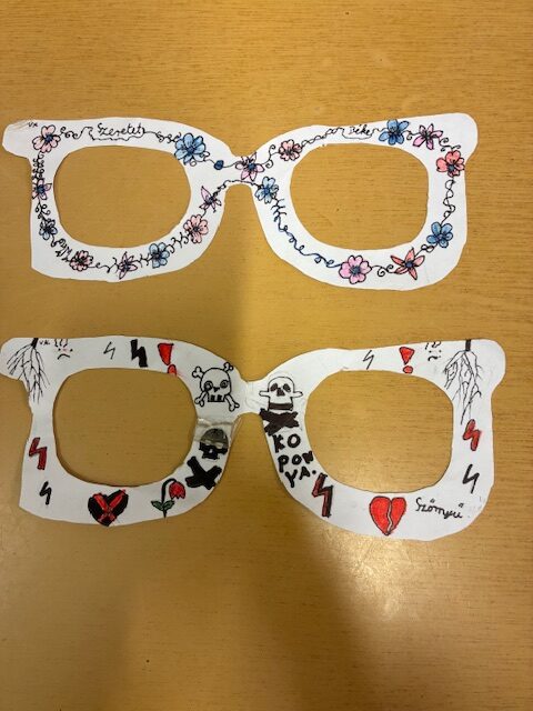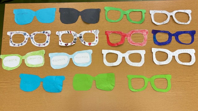 Az óra elején egy akasztófa-játékkal találták ki a hónap témáját. Aztán megbeszéltük az optimista- pesszimista szavak jelentését, idézeteket segítségül hívva. Lelkesen elkészítettük az optimista és pesszimista szemüvegeket, és megpróbáltunk különböző szituációkat megoldani a szemüvegek váltogatásával. Lazításként OpTIppeket adtunk az öltözködésben, otpimista ruhadarabokat, kiegészítőket terveztünk. A többség a saját kedvenc ruhadarabját rajzolta le, hiszen abban érzik legjobban magukat. Úgy gondolták, akkor tudnak optimistán gondolkodni, ha jól érzik magukat a kedvenc viseletükben. Optimista hangulatban telt az óra, de azzal a tanulsággal, hogy ezt a szemléletet a mindennapokban azért még gyakorolni kell.