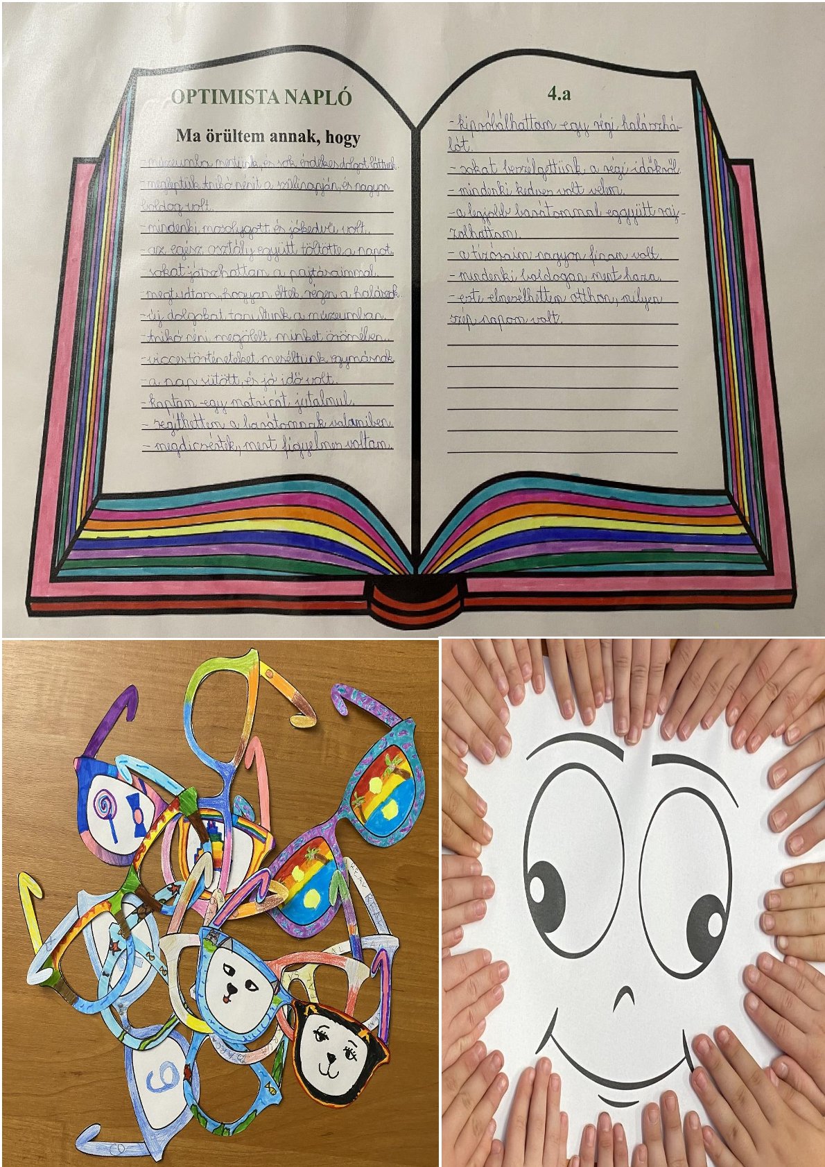 A diákok közösen gondolkodtak el azon, mit is jelent derűsen szemlélni a világot. Bence és a törött esernyő története segített nekik felismerni, hogy nehézségek közepette is lehet vidám gondolatokat találni. Kulcsszavakat gyűjtöttek, majd saját készítésű „pozitív szemüvegen” keresztül próbálták meg a hétköznapi eseményeket jókedvűen értelmezni. Gondolataikat játékos mondatbefejezésekkel örökítették meg az osztály optimista naplójában. A programot egy vidám mosolygyűjtéssel zárták, ahol mindenki elmondhatta, mi okoz számára örömet.
