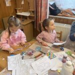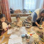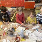 papírszemüveg, színes ceruza, ragasztó, díszitő eszközök.