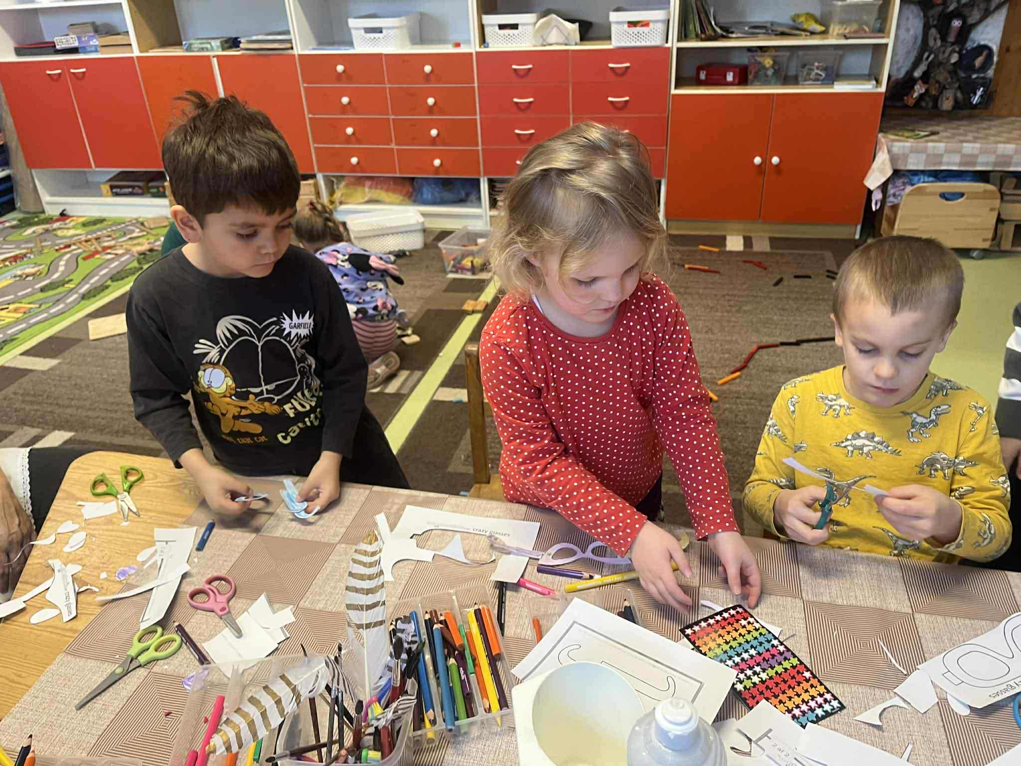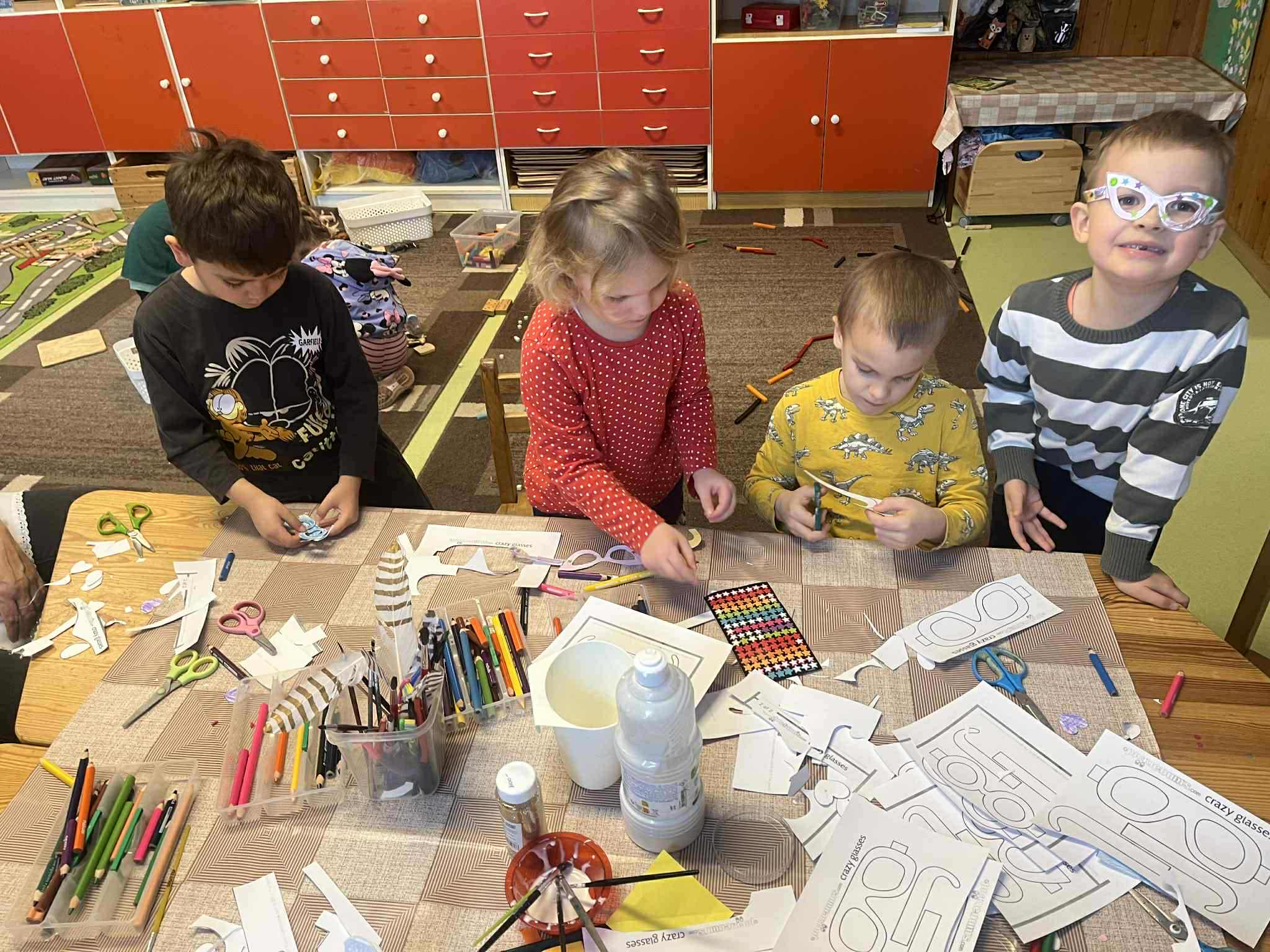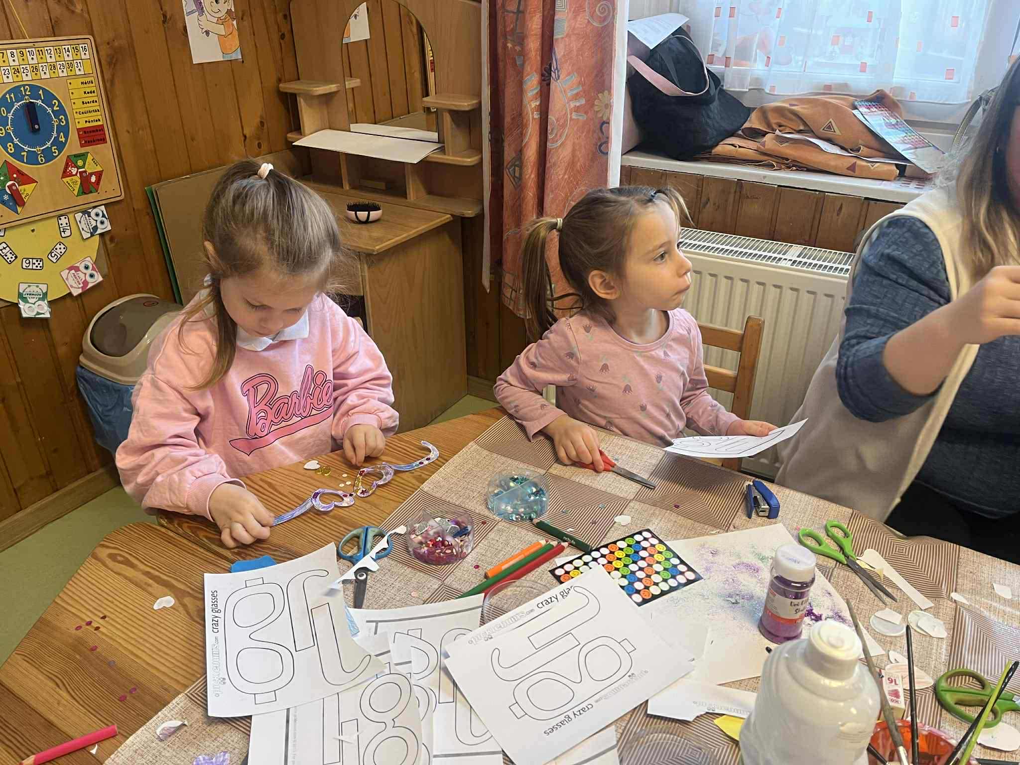 papírszemüveg, színes ceruza, ragasztó, díszitő eszközök.