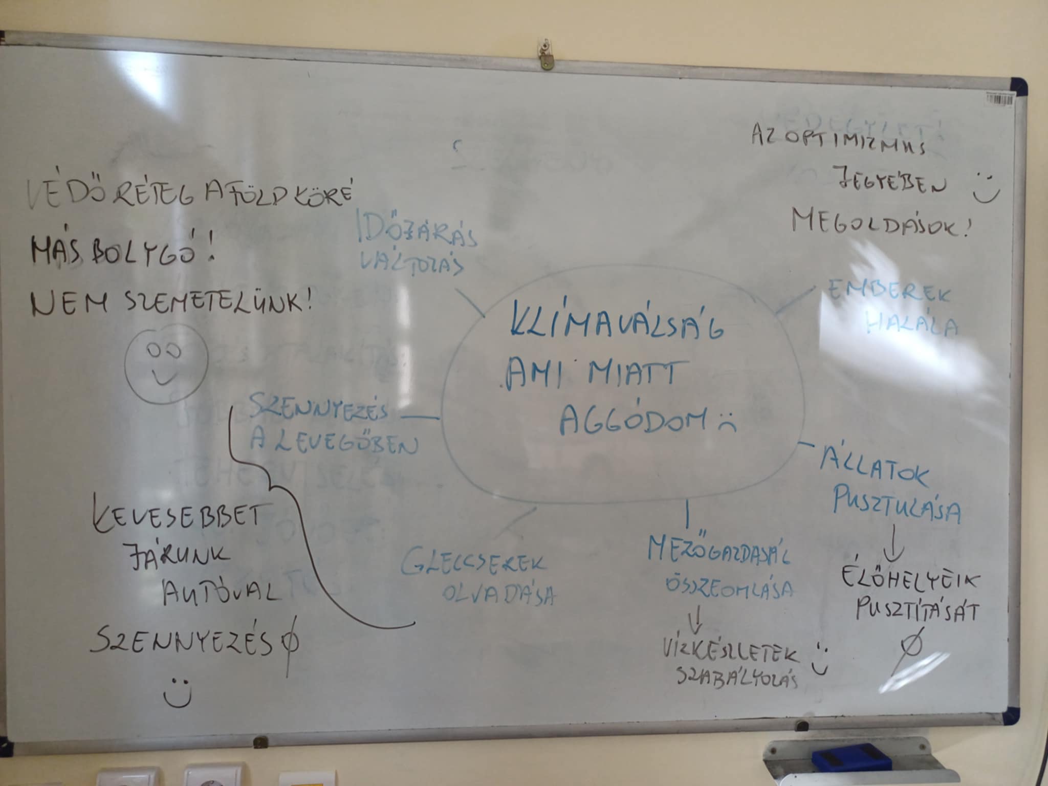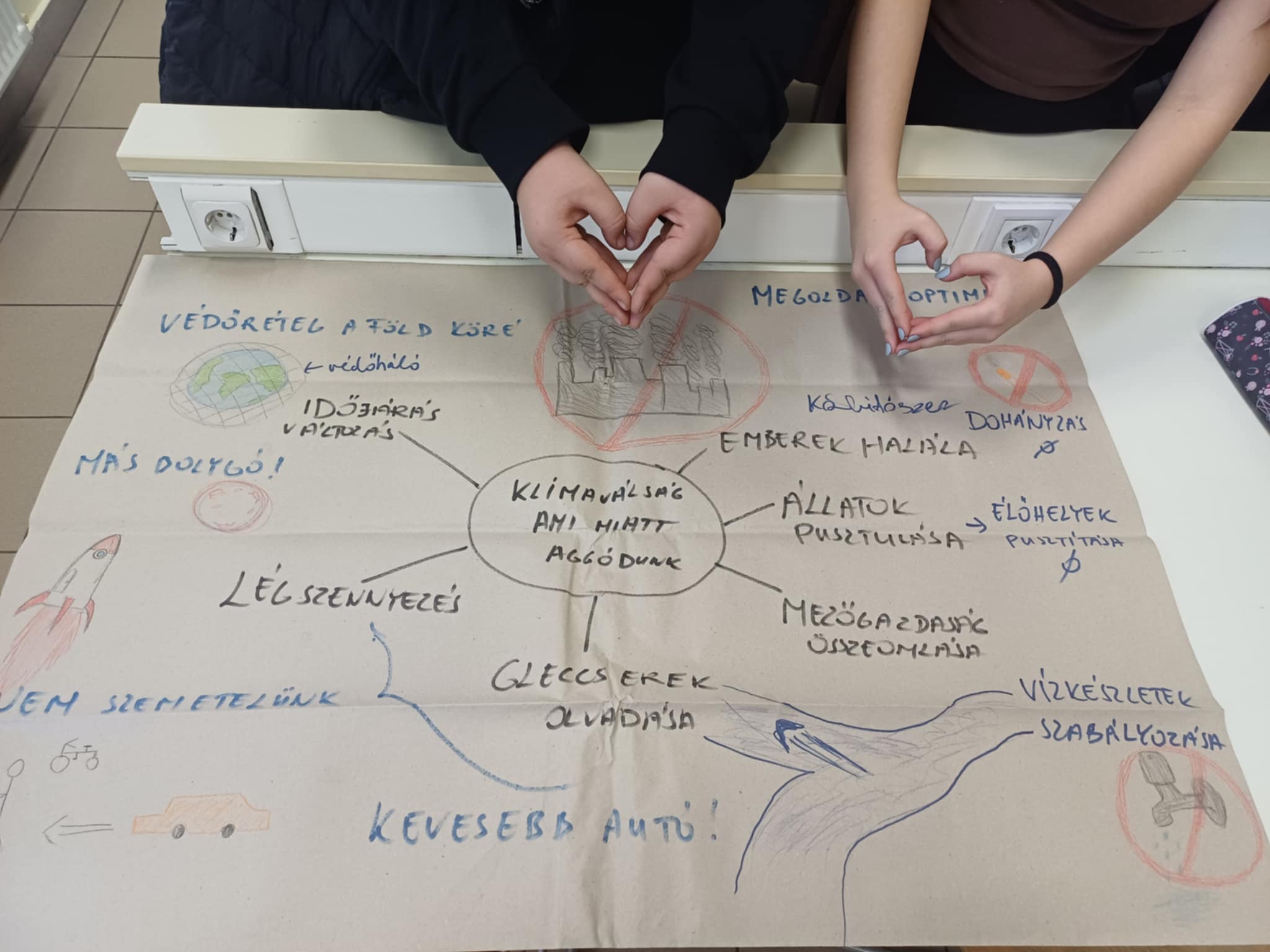 Ebben a hónapban az optimizmus gyakorlása volt a Boldogságóra központi témája. Az osztállyal a biológia tananyagba ágyazva igyekeztünk kreatívan feldolgozni a témát. A környezetvédelemhez kapcsolódóan előtérbe került a klímaválság kérdése, mely sokakból szorongást és kellemetlen érzéseket válthat ki. Elsőként megoldottunk egy korábban általam létrehozott WordWall feladatot a témához kapcsolódóan, majd a táblára összegyűjtöttük, hogy mi az, ami a diákokban a klímaválsággal kapcsolatban negatív érzéseket kelt. Ezt követően az optimizmust gyakorolva próbáltunk akár kreatív megoldási javaslatokat összegyűjteni. Hogyan tudunk pozitívak maradni a klímaválsághoz kapcsolódóan? Erre a kérdésre kerestük közösen a választ, végül egy nagy plakáton is megfogalmaztuk szöveggel és rajzzal is a gondolatainkat. Élőhelyvédelem, a szemetelés és a légszennyezés megszüntetése mellett kreatív gondolatként megjelent a Földről való elköltözés, vagy a Föld speciális védőburokkal történő beburkolása is. A lényeg azonban az volt, hogy a diákok érzékeljék, ha optimistán állunk a problémákhoz, sokkal könnyebb kreatív megoldási javaslatokat, lehetőségeket és reményt találni. A plakátot kihelyezzük majd az osztályban, vagy a biológia tanteremben is, hogy mindig jusson eszünkbe van, lehet megoldás erre a problémára is.