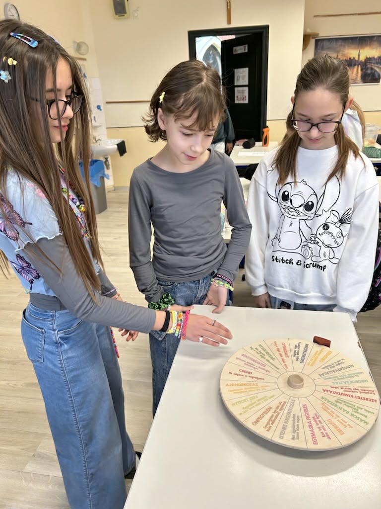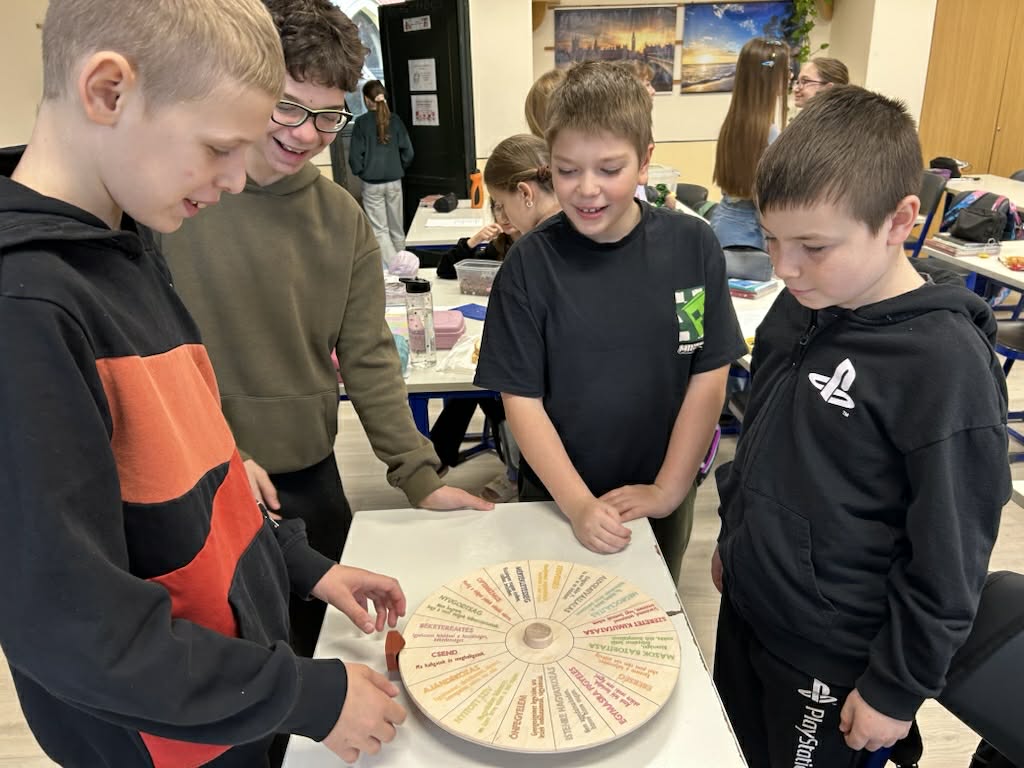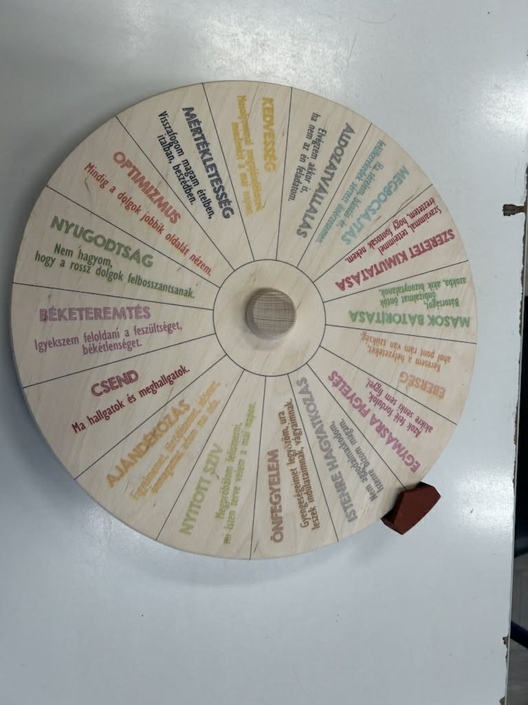 Csoportomban meghallgattuk Bagdi Bella a Világomban minden rendben van című dalát. Beszélgettük arról, hogy mit jelent az a szó, hogy optimizmus, pesszimizmus, milyen jellemzői vannak az optimista, illetve pesszimista embereknek. Csoportokban megfejtették a tanulók a táblázatban elrejtett svéd bölcsességeket, „lefordítottuk azokat” vagyis értelmeztük őket. Majd egy általam az órára bevitt szerencsekerékkel játszottunk. Mindenki forgatott, s a kapott tanácsot önmagára értelmezte.