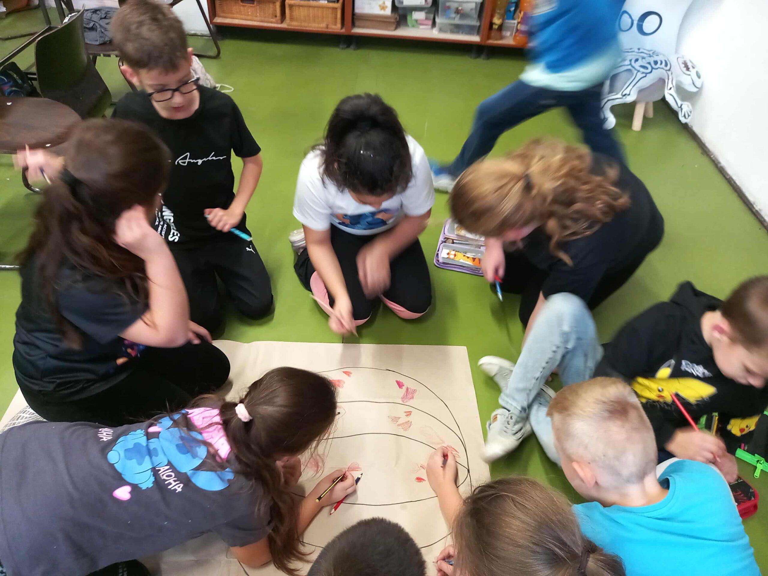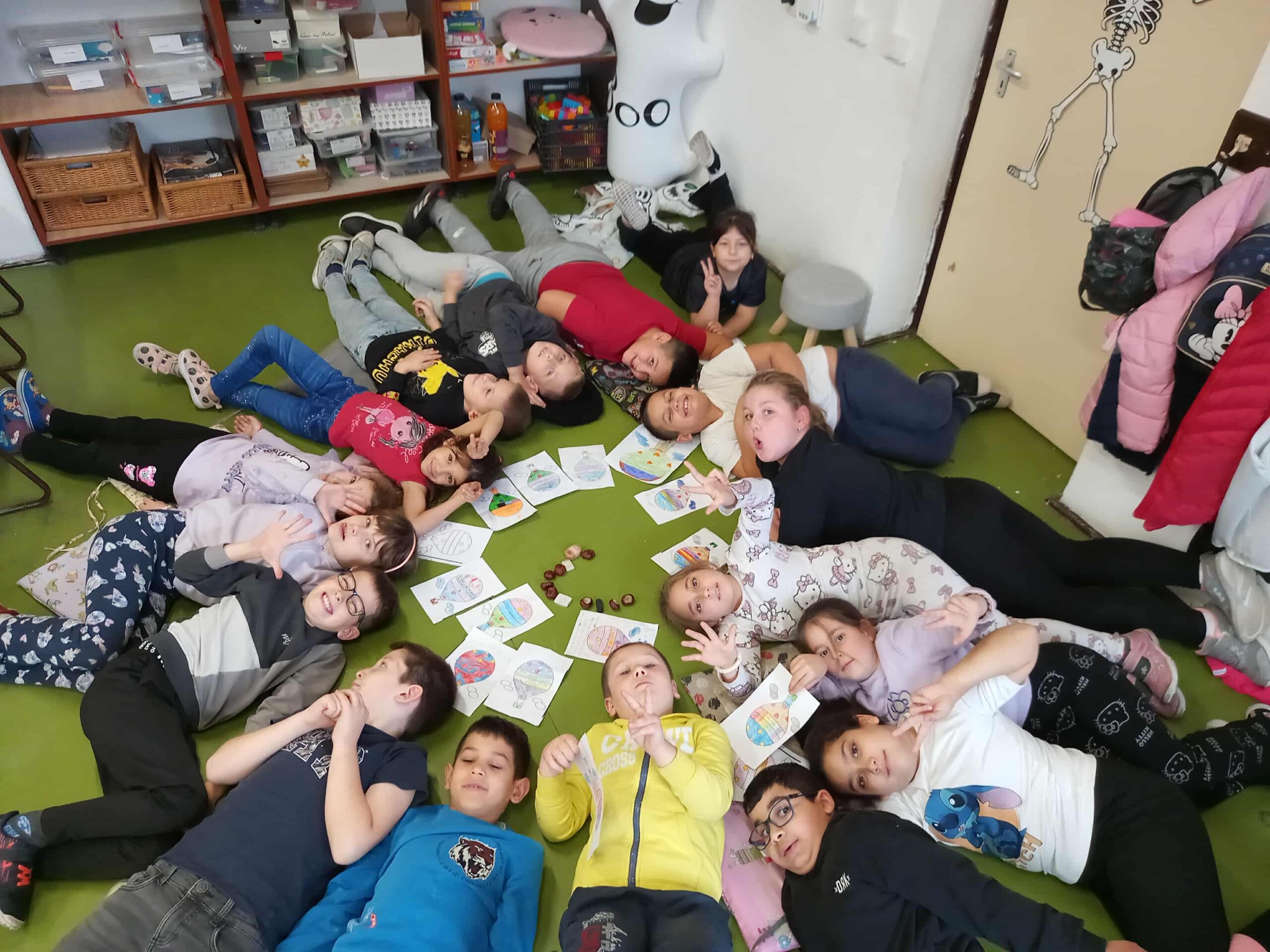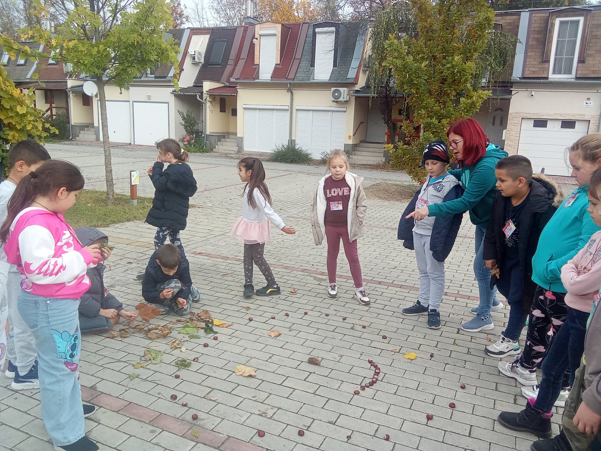 A gyerekekkel gesztenyét gyűjtöttünk, majd a tanteremben körbe raktuk őket a padlóra. Mindenki elmondta a saját félelmét vagy azt, amit még nem tud megcsinálni. Fontos volt, hogy mindig hozzátegye a „még” szót, pl.: „Még nem tudok úszni.” Ezután közösen megbeszéltük, mit kell tenni ahhoz, hogy sikerüljön: „Ha kitartóan gyakorlom, hamarosan sikerül!” Ahogy a gesztenyék gyűltek, a gyerekek észrevették, hogy szinte véletlenül egy szívformát rajzoltak ki velük. Ez megható jelképpé vált: a félelmekkel való szembenézés és azok legyőzése nyitott szívvel és bátorsággal válik lehetségessé.