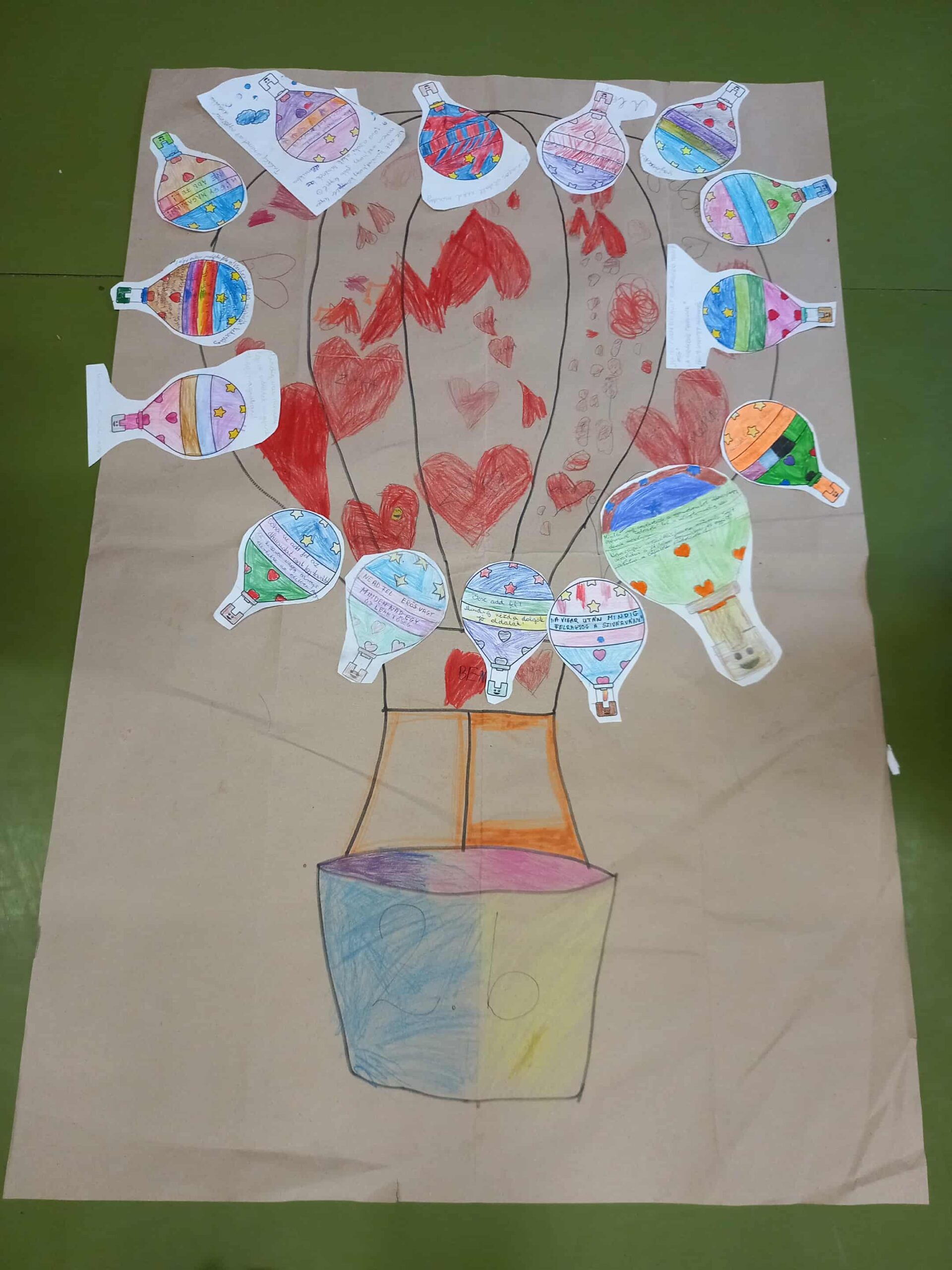 Ezután elkészítettük a közös hőlégballont, amely azt szimbolizálta, hogy nincsenek korlátok, amelyek megakadályozhatnak bennünket céljaink elérésében. A gyerekek közösen színezték ki a nagy ballont egy kisebb hőlégballonra a szülők biztató szavai kerültek arról, hogyan támogatják gyermekeiket. Így a két ballon együtt fejezte ki, hogy a saját hitünk és a szülői szeretet együtt emel minket magasba.