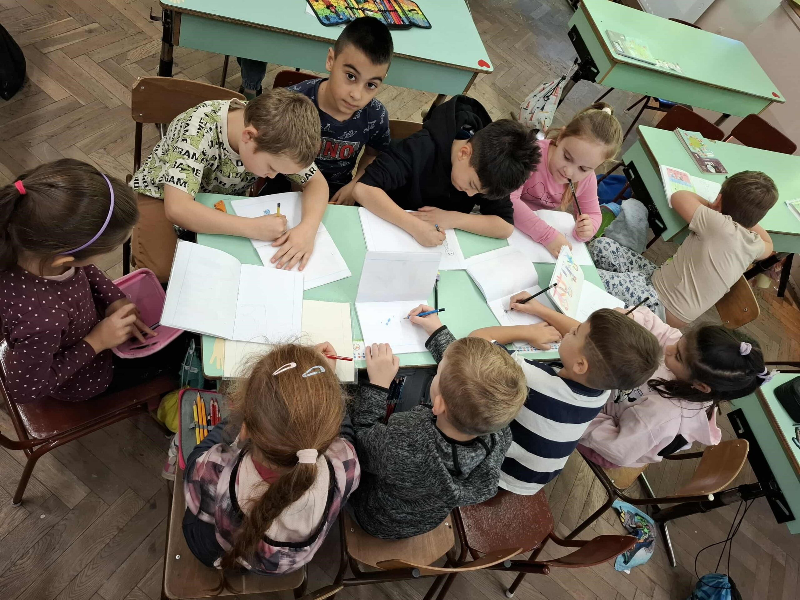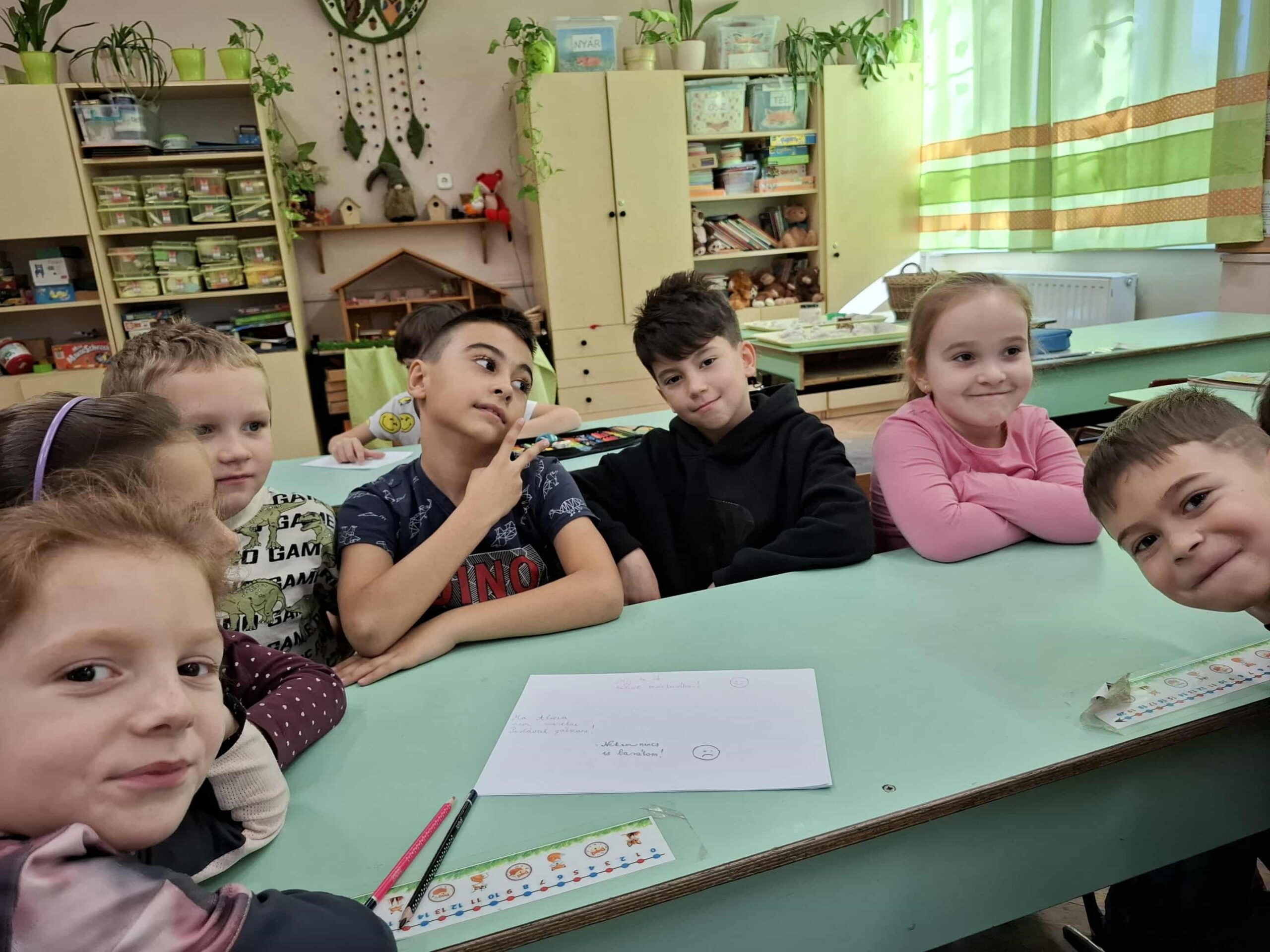 A mostani témát az elsőseinkkel elég nehezen tudtuk feldolgozni. Nagyon nagy magyarázatot igényelt, hogy mi is az az optimizmus- pesszimizmus. Több lehetőséget kerestünk és hozzájuk gyűjtöttünk pozitív és negatív gondolatokat. A végén a pozitívból mindenki választott egyet amit meg is próbáltunk lerajzolni.