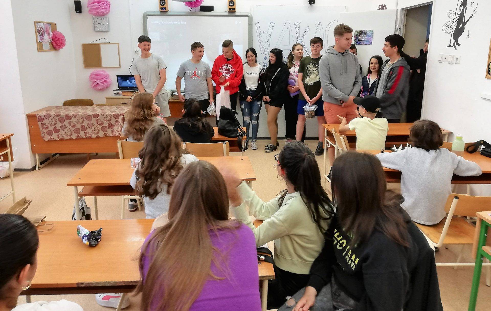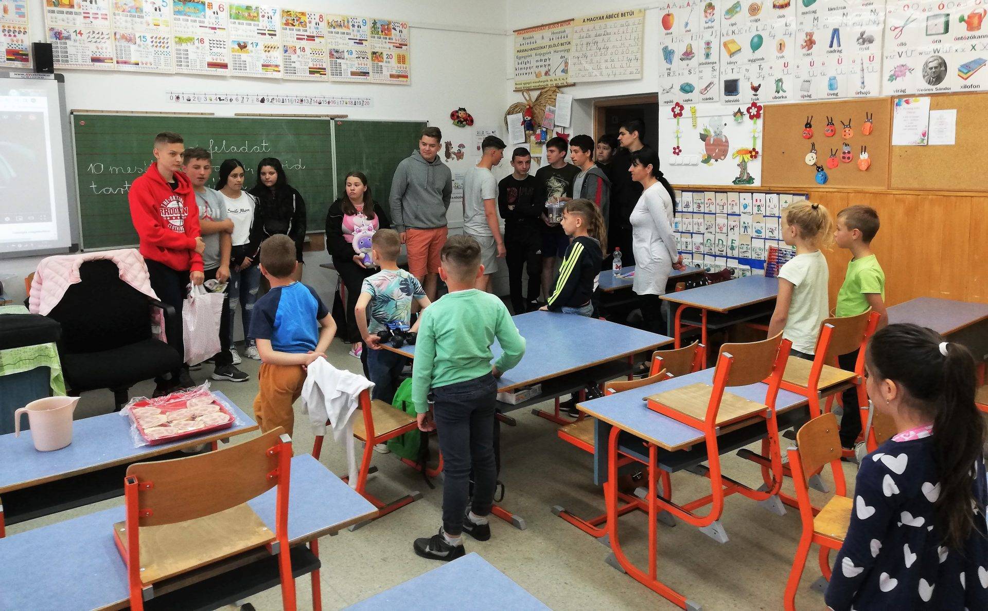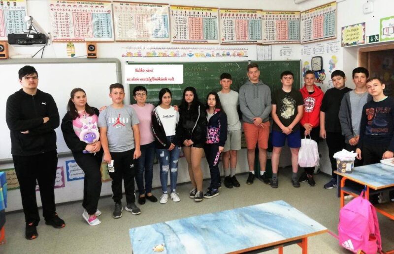 Iskolánkban egy régi hagyományt elevenítettünk fel az utolsó tanítási napon. Pénteken a nyolcadikosok bekopogtattak az osztályokba, és egy rendhagyó búcsú keretében elköszöntek diáktársaiktól. A kisebbek megilletődve, a nagyobbak is kissé elcsendesedve fogadták őket. Mindnyájan örültünk a tanév utolsó napjának, de az örömet ezúttal a búcsú megható pillanatai kissé átszínezték. A búcsúszavak után egy kis édességgel lepték meg az itt maradó társaikat a ballagók: „Kell egy kis energia a nyárhoz és az újabb tanévhez majd!” – szóval, aztán elkészültek az utolsó közös fotók is. A nap egyik emlékezetes fényképén az egykori, alsós osztályfőnökkel álltak össze egy képre az elköszönő nyolcadikosok.