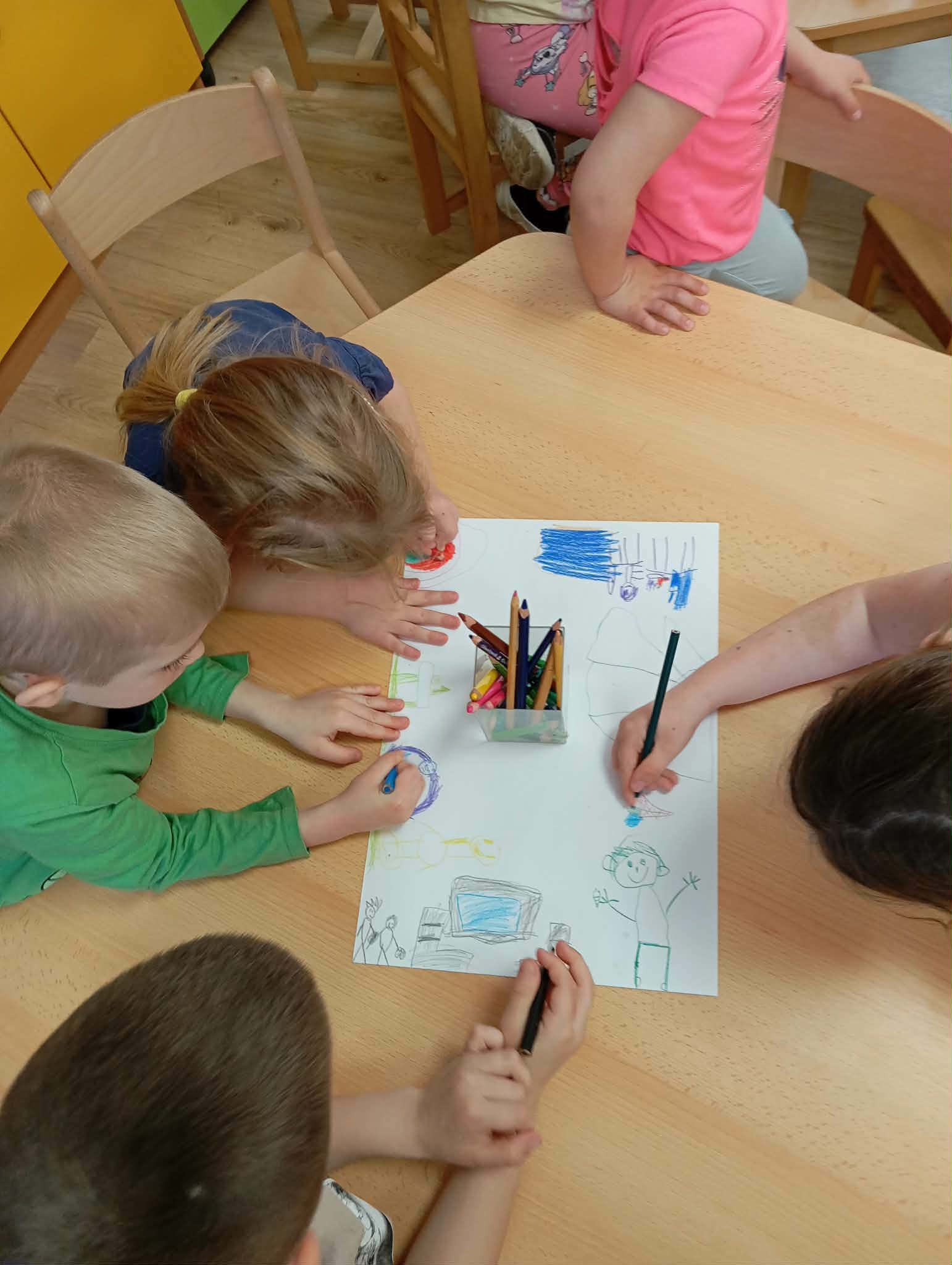 A tevékenység lezárása képen csoportokban rajzolták le a gyerekek egy-egy örömteli pillanatukat. A kisebbek még csak firkálás szintjén, de a nagyobbaknál megjelentek értelmezhetőbb képek, mint a közös játék a barátokkal, medencézés, szivárvány nézése, óriáskerekezés a szülőkkel.