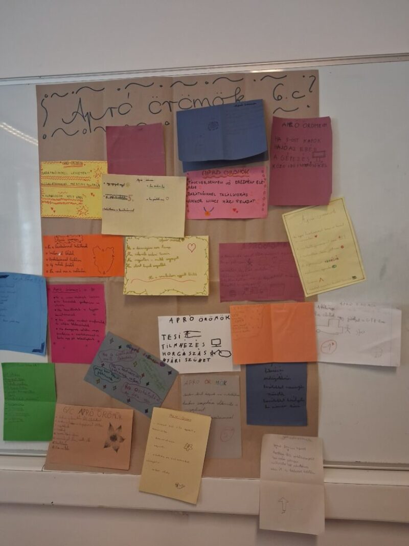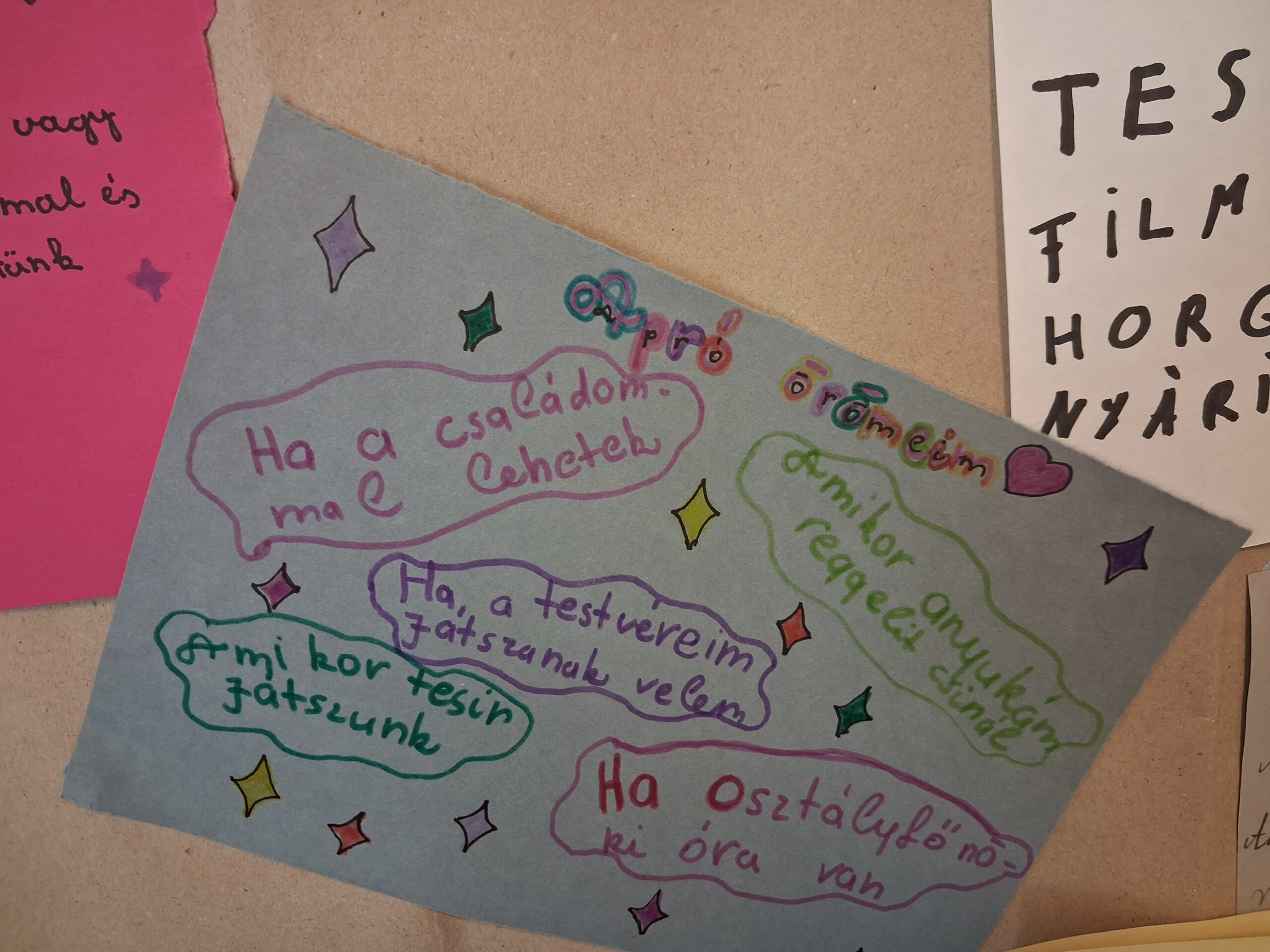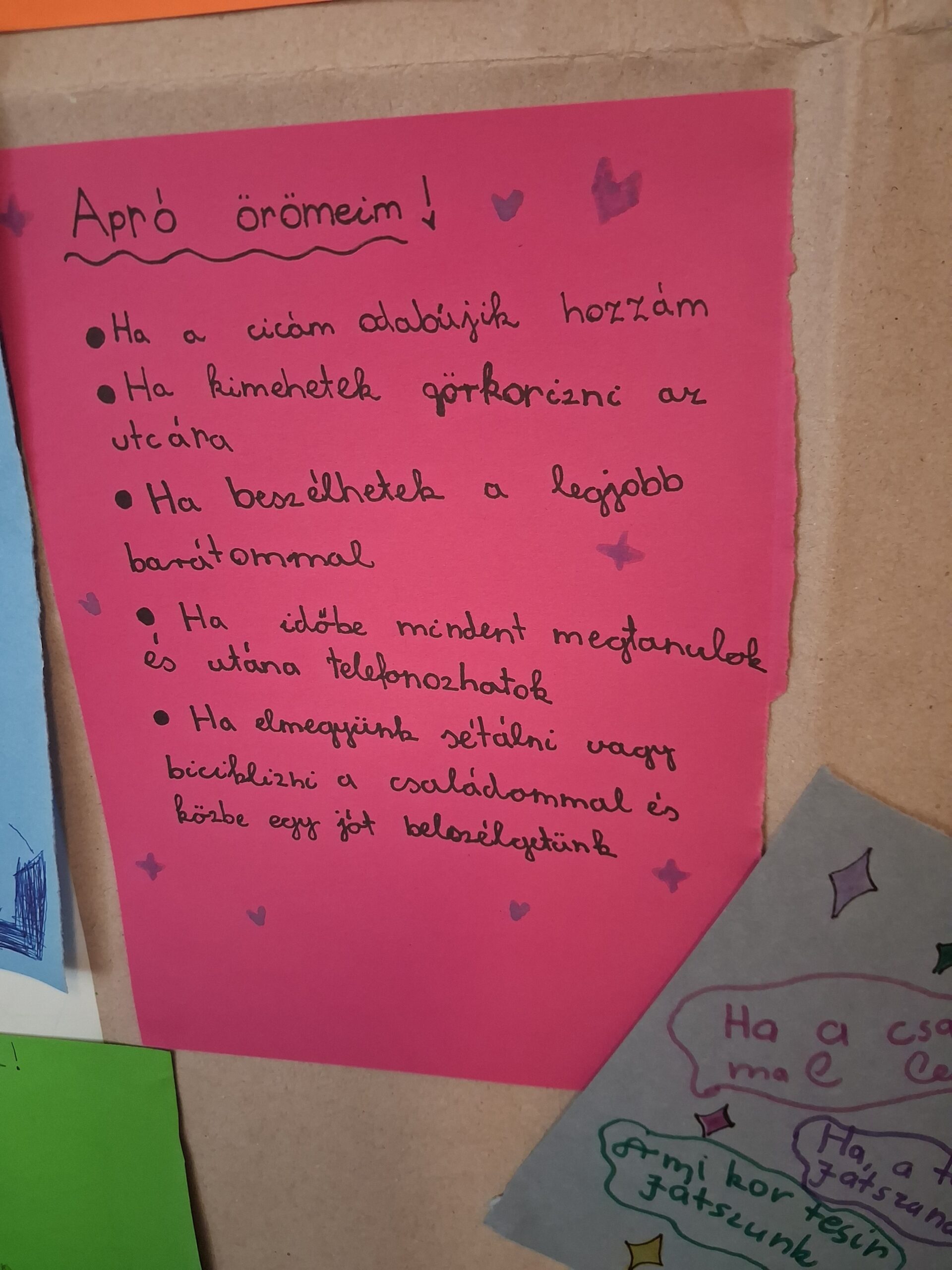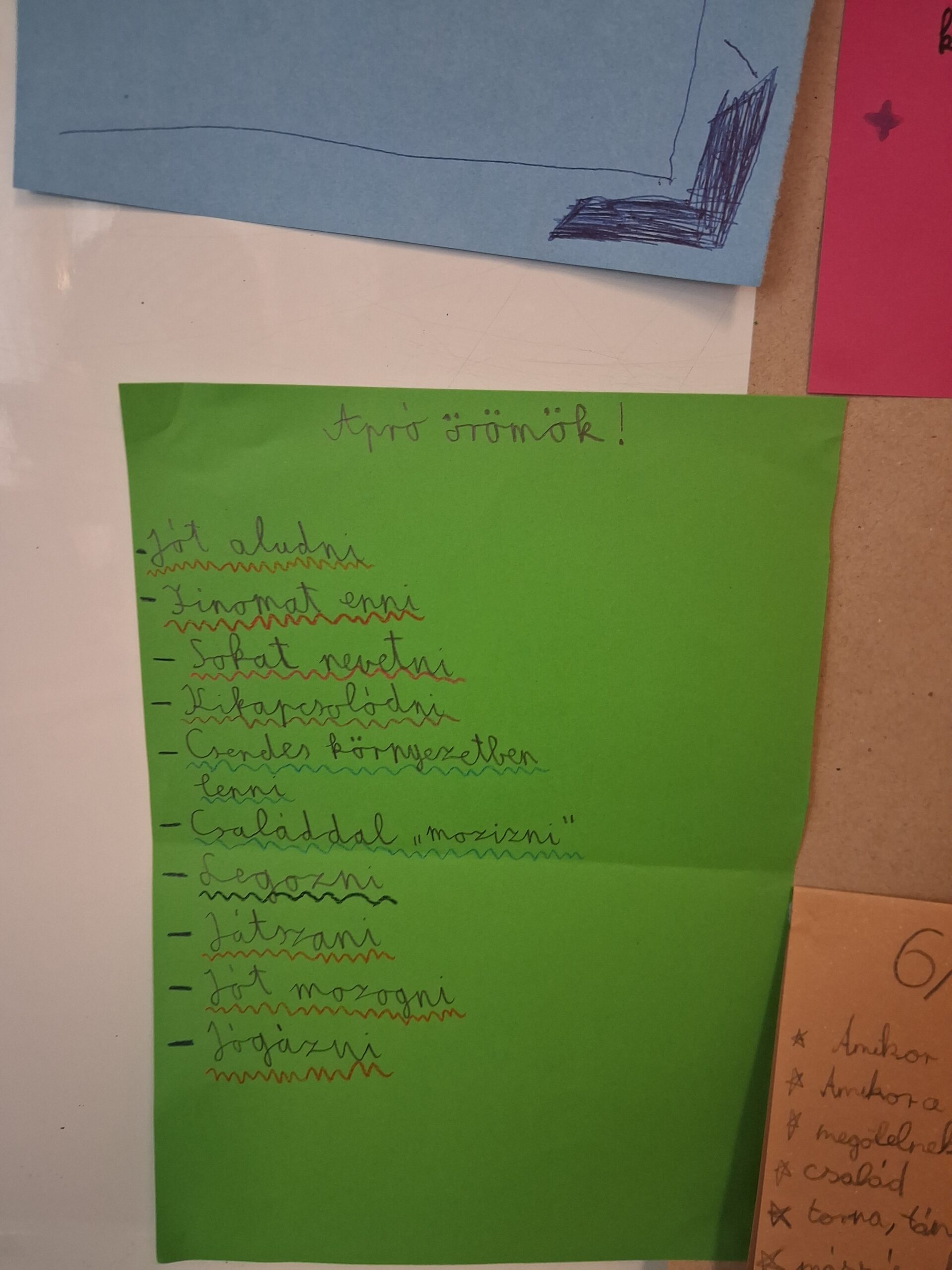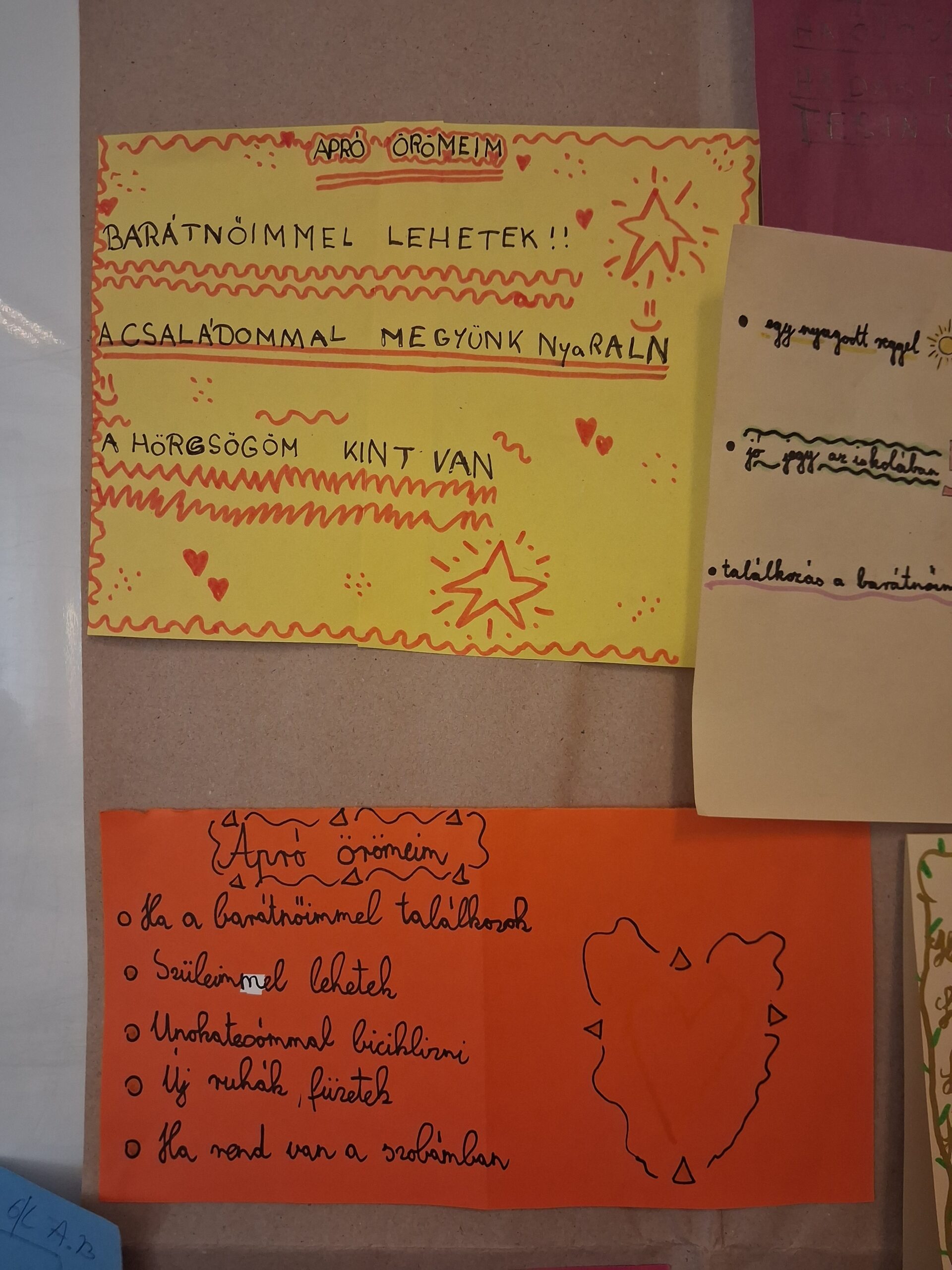 Ezt követően elkészítettük az osztály „Öröm plakátját”. Mindenki készített egy saját listát a számára fontos mindennapi örömökről, majd ezek felhasználával elkészült az osztály közös plakátja. Zárásként azt a gondolatot fogalmaztuk meg, hogy az életben sok apró öröm van és ha figyelünk rájuk, könnyebben leszünk boldogok.