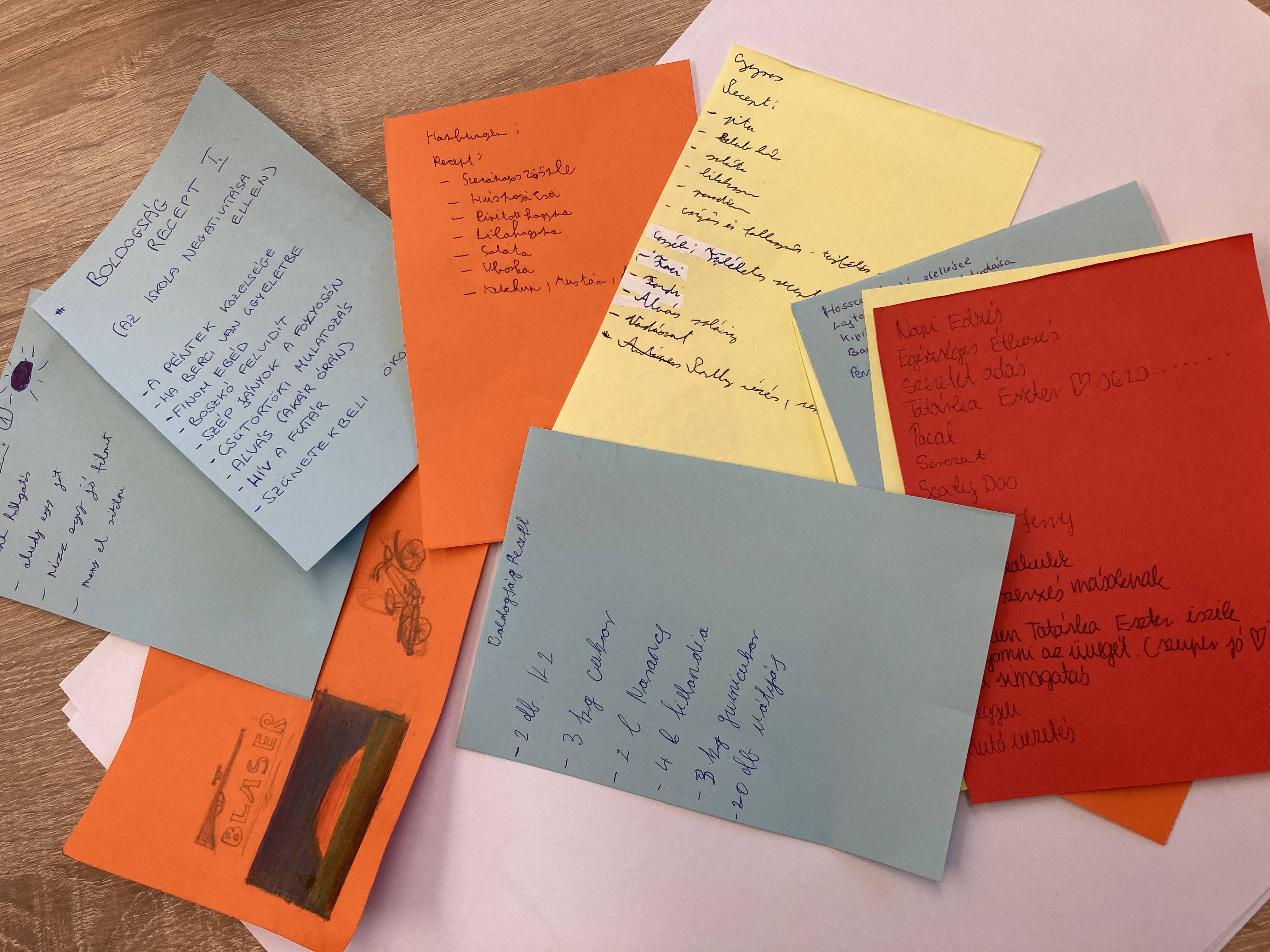 1.) Örömrecept: olyan recepteket készítettek társaiknak, melyek negativitás vagy szomorúság esetén erőt adnak, örömforrások lehetnek a mindennapokban. Elvárás volt, hogy beváltható és megvalósítható receptek szülessenek, mely receptek végül kikerültek az osztályterem falára is, hogy a közeljövőben használni tudjuk őket, ha szükséges. (3.kép)