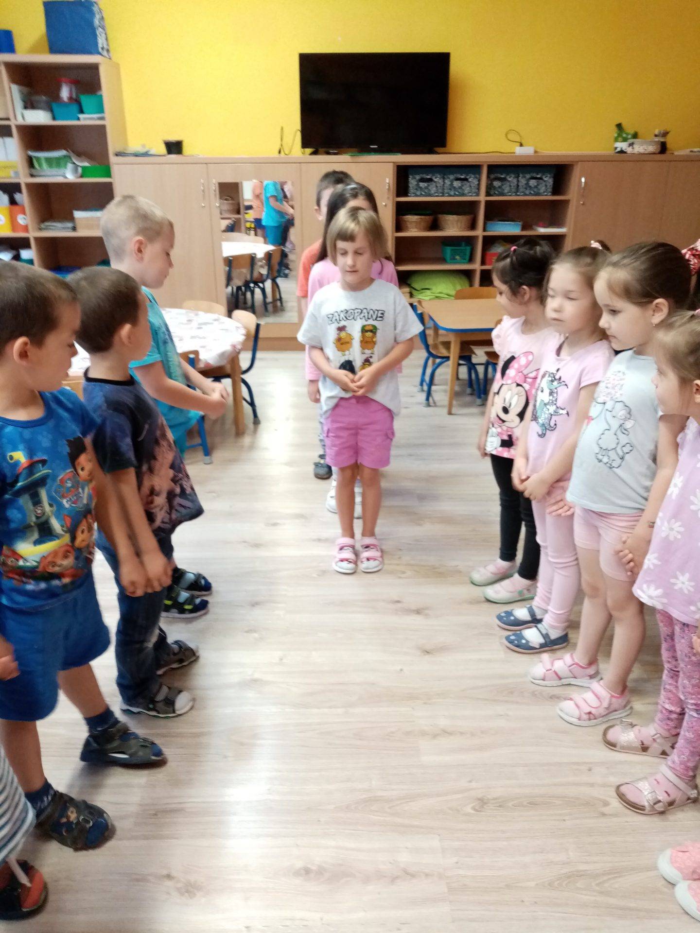 Táncos, dalos játékokat játszottunk, ismételtük az egész évben megismert énekes játékokat, verseket. Bagdi Bella hívó dalára összegyűltünk, „bizalomhidat” építettünk gyermekekből. A hídon bizalommal, behunyt szemmel sétáltak át ballagó gyermekeink miközben a többi gyermek egy-egy jó tulajdonságukat mondta el. Zárásként boldogságfüzért színezhettek.