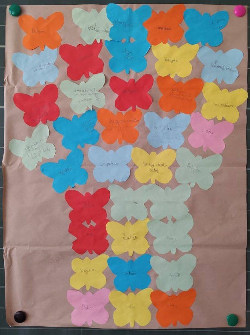 A hónap elején elkészítettük egy technika óra folyamán a pillangóikat, amire az apró örömeinket jegyeztük fel. A pillangókat a tolltartóban tartottuk, hogyha valami öröm ér minket, azonnal fel tudjuk írni. A kész pillangókat összegyűjtöttem s a Boldogságóránk során közösen összeállítottuk az Örömfákat, s közben visszaemlékeztük ezekre az apró örömökre. Ebben a hónapban a közös mozgásos feladatok ( pl. Metronómos, vagy a ritmusos ) nagyon tetszett a gyerekeknek. Így ezeket későbbiekben is fel fogom használni például az ének óráimon.