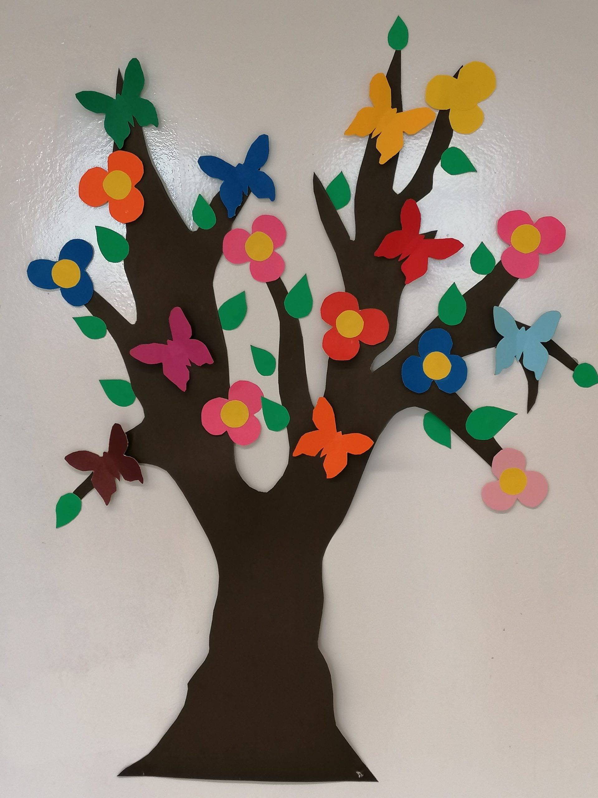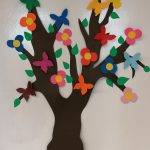 Elkészítettük a fát. A gyerekek virágokat és pillangókat rajzoltak, melyeket kivágtak.