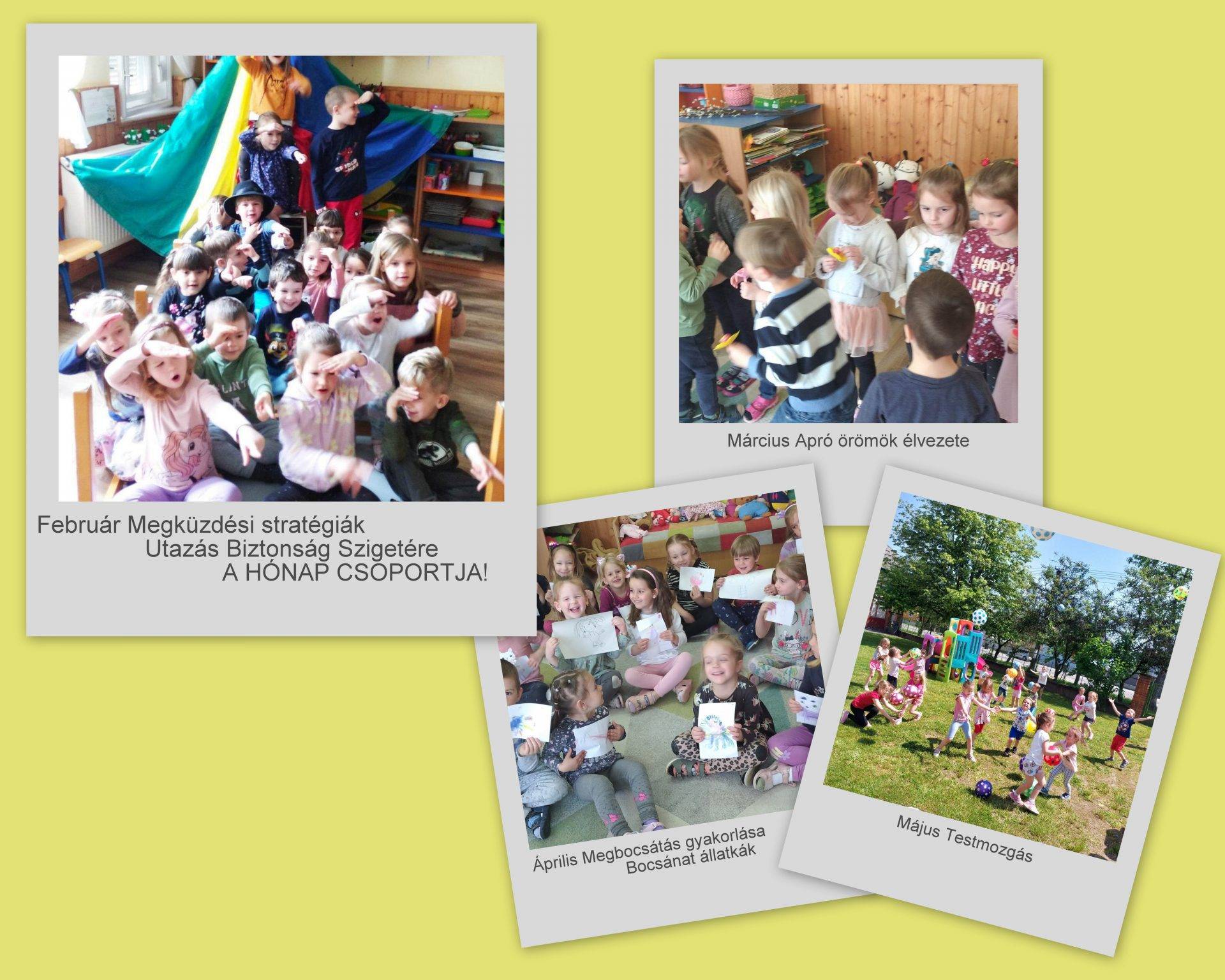 Mi az Érzékletes Boldogságfal helyett Érzékletes Boldogságnapokat tartottunk: minden nap újranéztük az egyes hónapokról készített felvételeket, felelevenítettük, miről is szólt a hónap, milyen játékokat játszottunk, melyik volt a kedvenc feladatunk, mi minden történt velünk az adott hónapban. Így láttuk újra