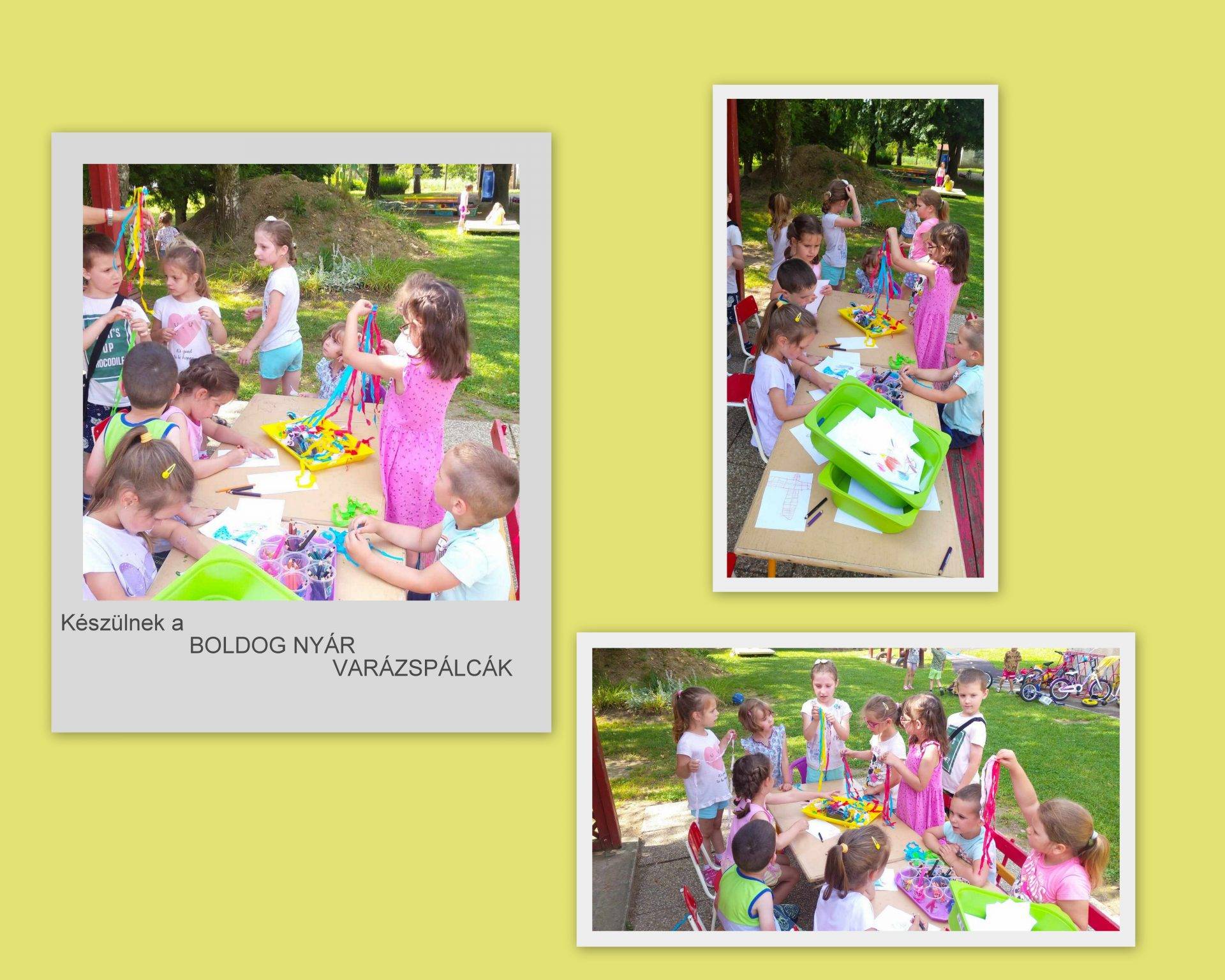 – és már el is érkeztünk a júniushoz: ahol elvégeztük az Örömteli Összegzést, elkészítettük Boldog Nyár Varázspálcáinkat, melynek segítségével a Bosszúságok Szigetéről a Hősök Hídján átjutva mindenki boldogan érkezett meg Örömparkká változtatott óvodaudvarra, ahol a jól ismert játékok új kihívásokat tartogattak számukra. Majd hogy tovább fokozzuk a boldogságot,egy finom jégkrém mellett beszéltük meg, milyen kihívásokon mentünk át a nap folyamán
