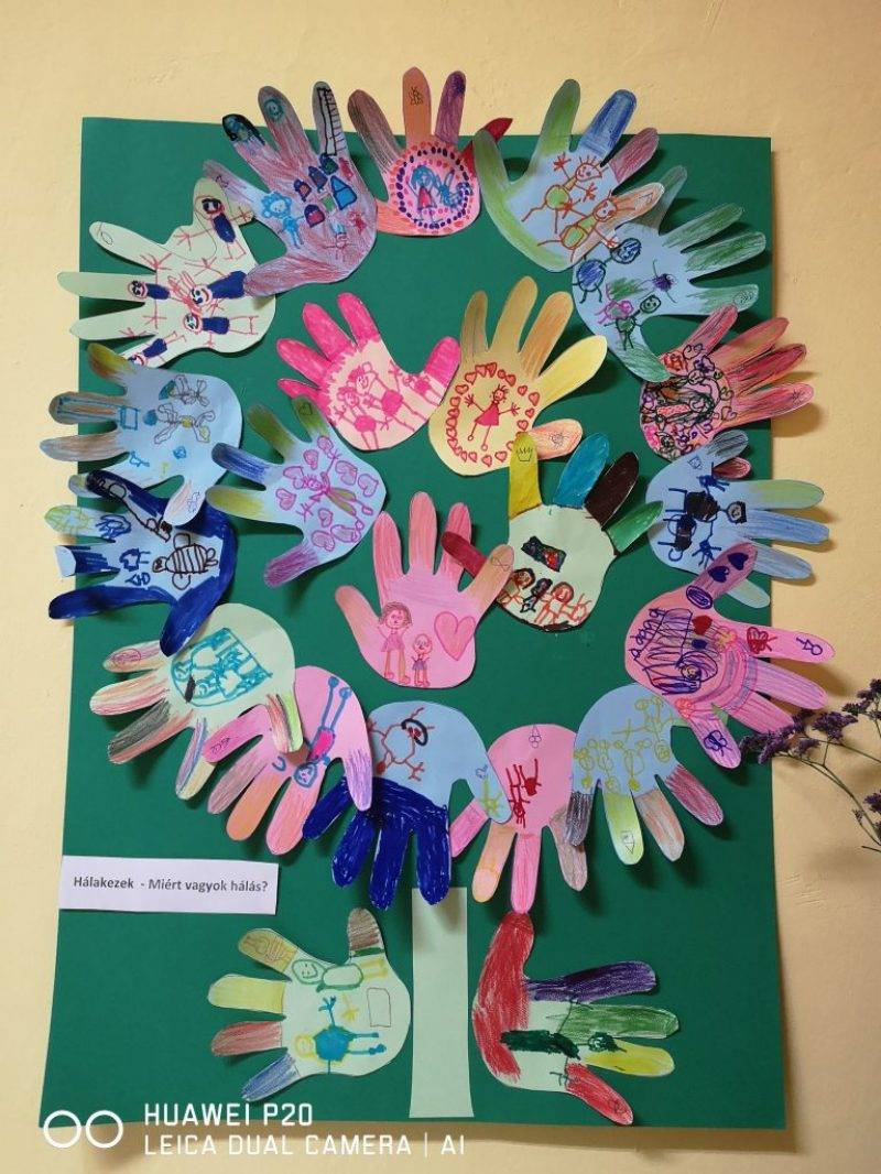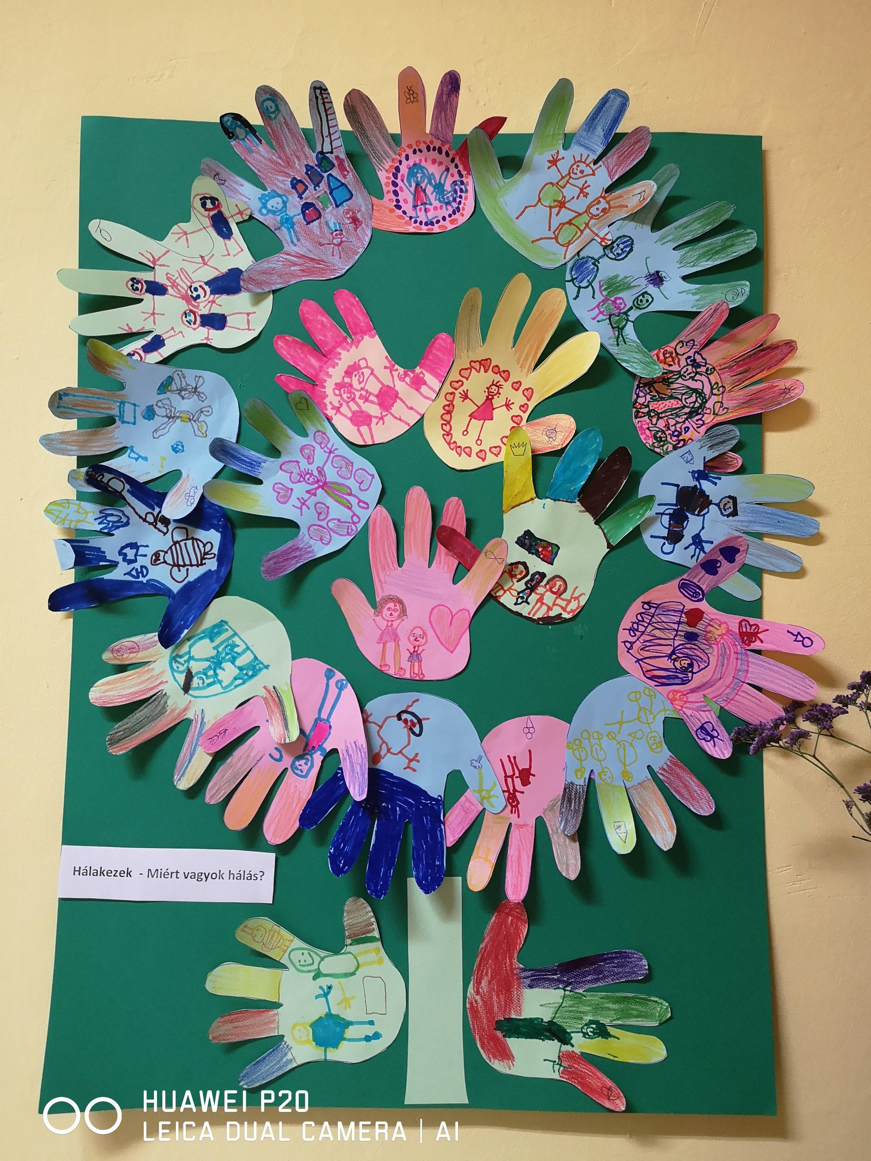 Ebben a hónapban a hála gyakorlását a hálafa történetének meghallgatásával, majd a történet feldolgozásával kezdtük. El készítettük a hálaleltárt, megismerkedtek a gyerekek a hála fogalmával, majd megfogalmazták azt, hogy ők miért hálásak, kinek miért mondhatnának köszönetet. Ezután mindenki körberajzolta a kezét és belerajzolta azt az egyetlen dolgot, amiért a leghálásabb. A kezekből készítettünk egy közös hálavirágot.
