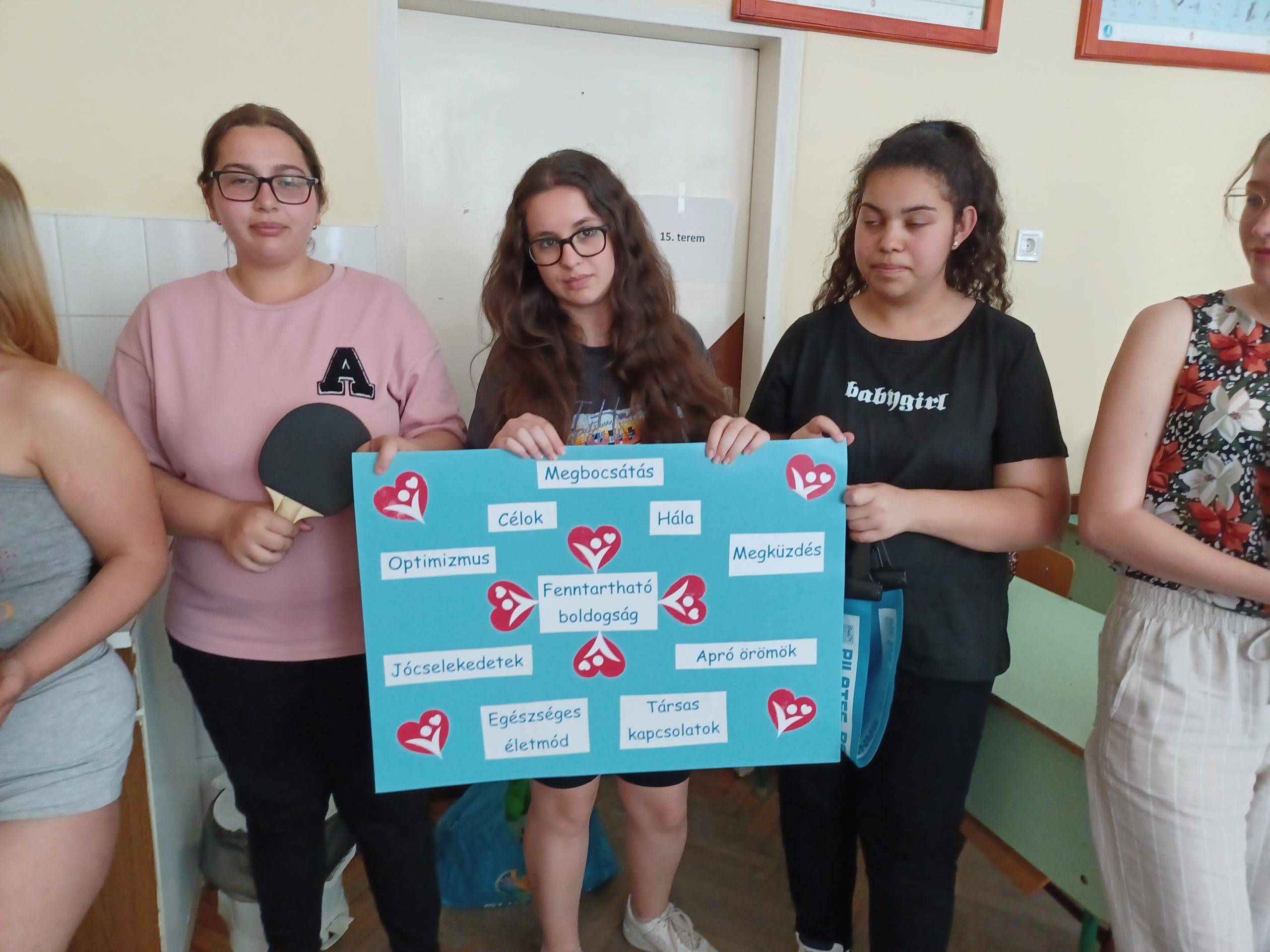 Az utolsó boldogságórát játékkal kezdtük (Kapu és kerítés), majd összegeztük a boldogságórák témáit. Ki kellett találniuk a diákoknak pár információ segítségével a kilenc témát, ezeket fel is ragasztották egy kartonra, ezt a főképünk. Majd röviden megbeszéltük ezeket, és végigkérdeztem, mit találtak a leghasznosabbnak.Három téma emelkedett ki: a boldogító jócselekedetek és a megbocsátás..