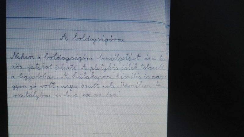 A gyerekeket megkértem arra, hogy írjanak egy fogalmazást arról, hogy mi tetszett a boldogság órákban, mi az ami a legjobb volt, amire a legszívesebben emlékeznek. A visszaküldött fogalmazásokban láttam azt, hogy a gyerekek szeretettel írtak ezekről az órákról.