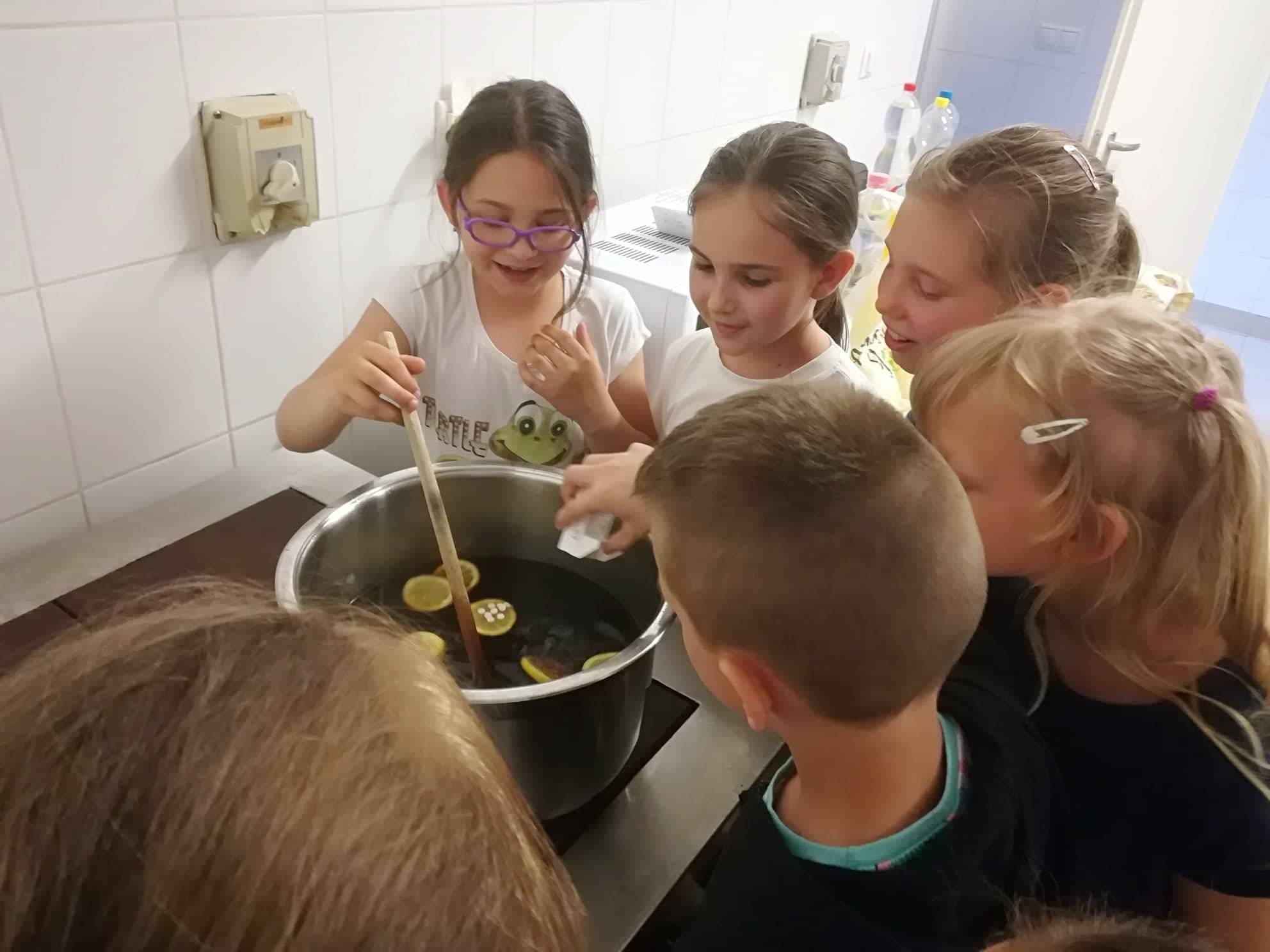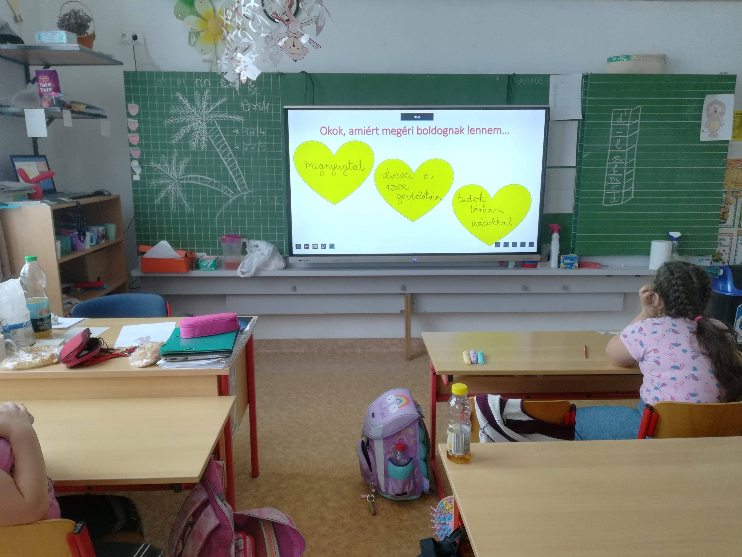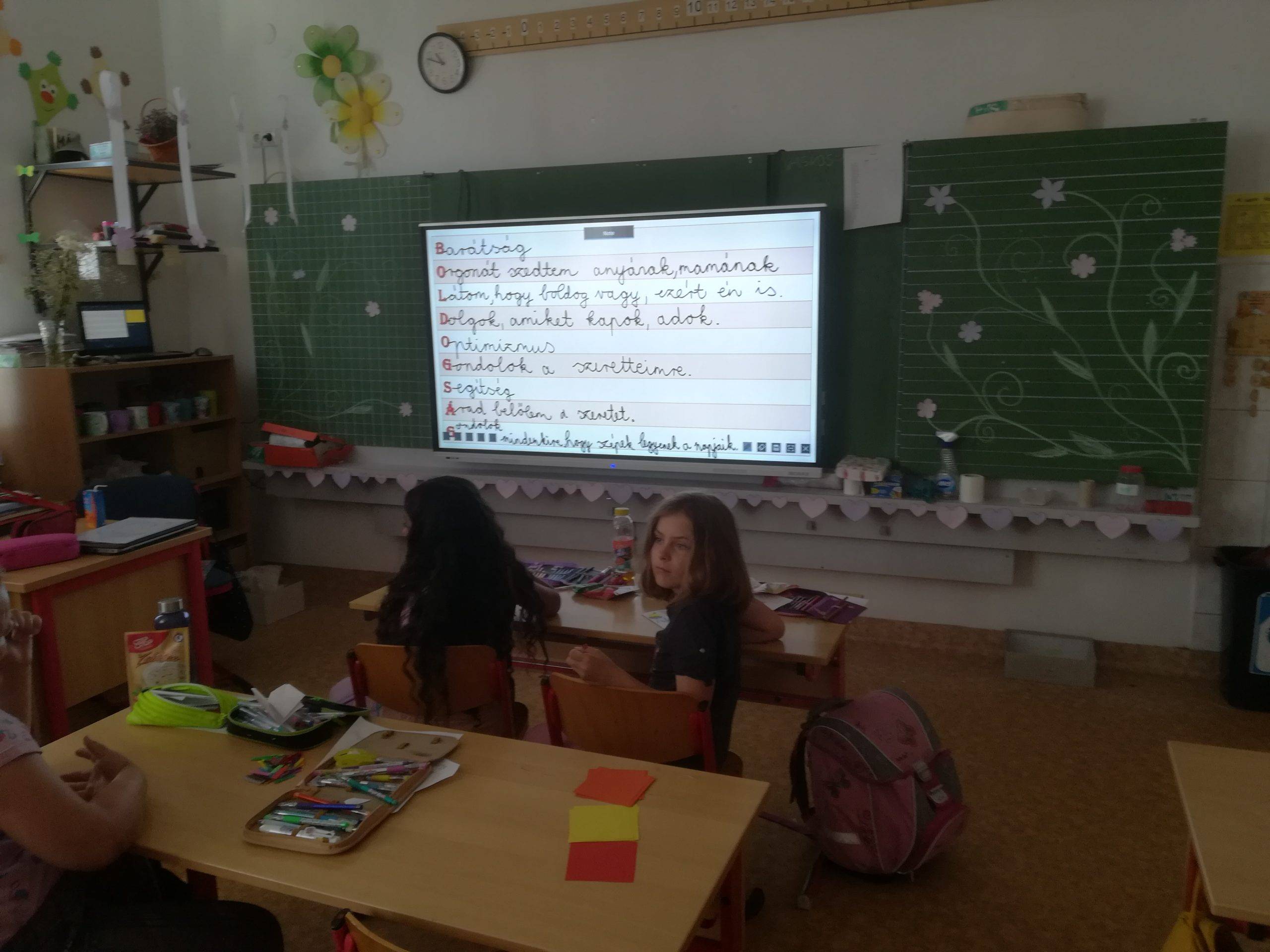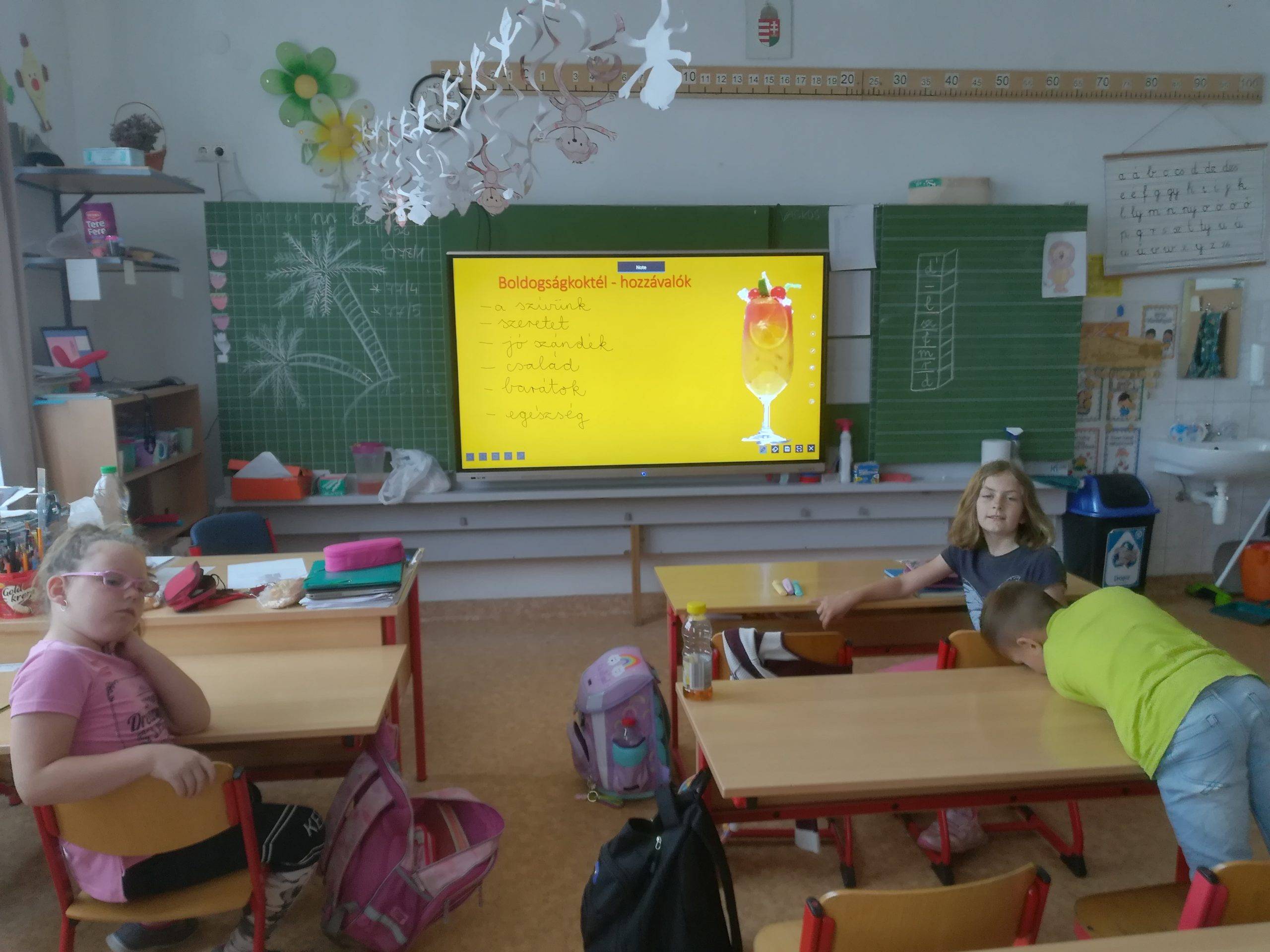 Június hónapban összegző foglalkozásokat tartottunk az elmúlt tíz hónap témáit illetően. Felelevenítettük a megismert boldogságfokozó technikákat, és megerősítettük magunkban/egymásban, hogy valóban érdemes ezeket a mindennapjainkba beépítenünk. Elkészítettük a Boldogságkoktélunkat, amihez a hozzávalókat gondosan állítottuk össze. ( A Boldogságkoktélt továbbgondolva bodzaszörpöt készítettünk, aminek a legnélkülözhetetlenebb alapanyaga a szeretet és összetartozás volt.) A Boldog ábécé hasznos volt arra, hogy minél több pozitív fogalmat gyűjtsünk. Beszélgettünk arról, miért érdemes boldognak lennünk. Megerősítő mondatokkal felépítettük a BOLDOGSÁG-ot. Továbbra is hiszünk abban, hogy jobb velünk a világ!