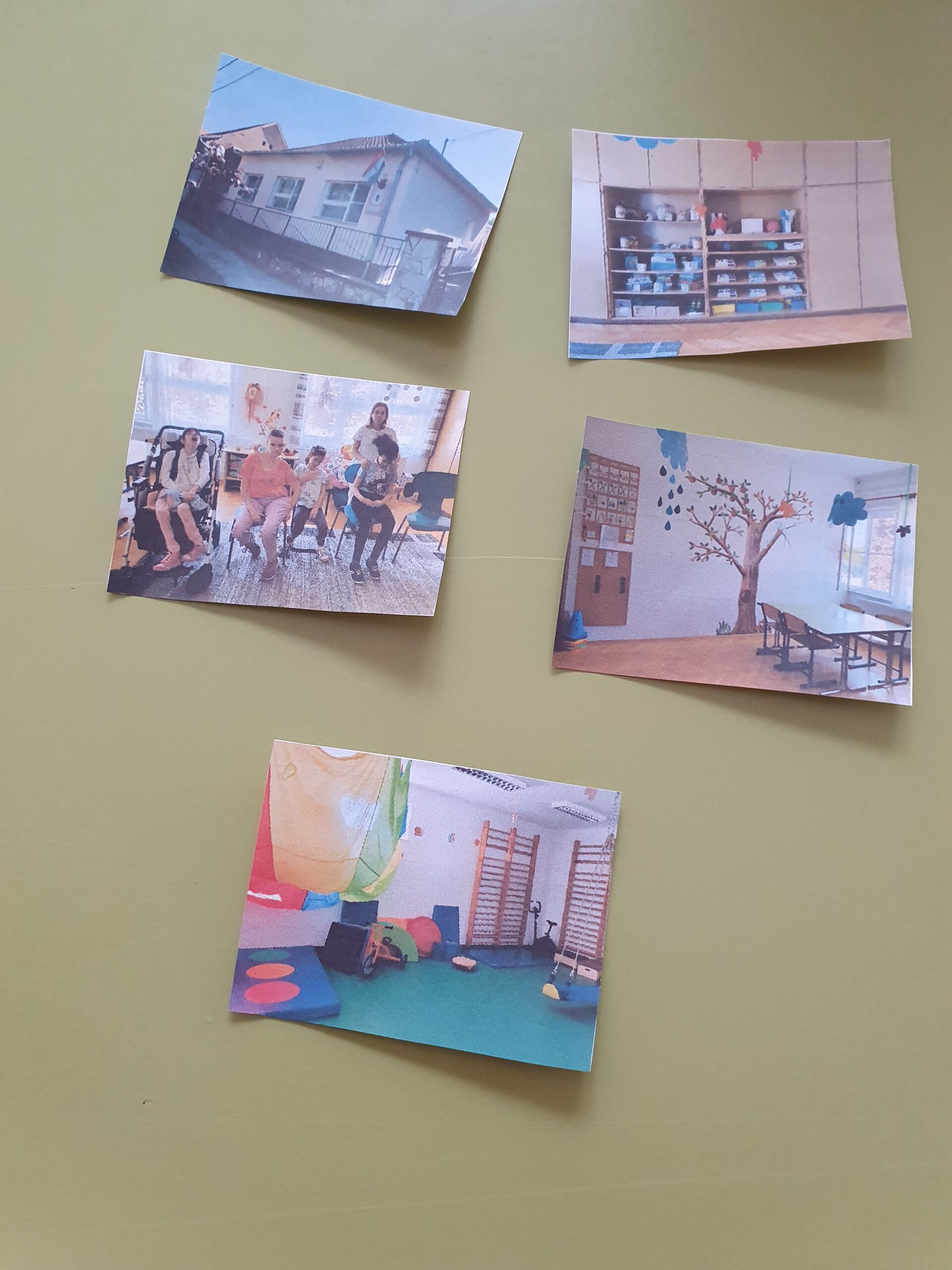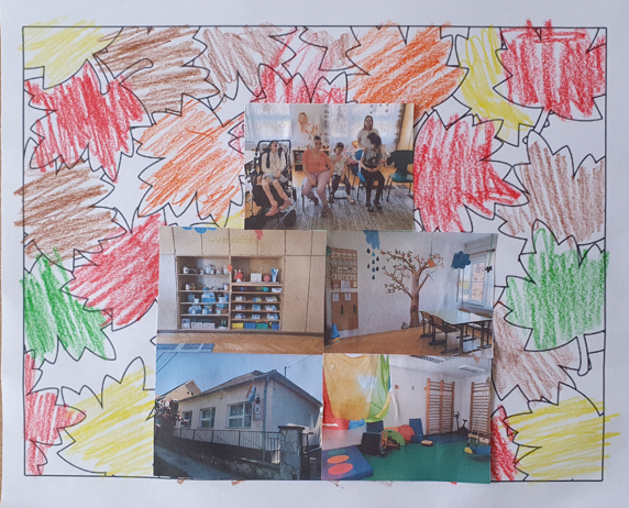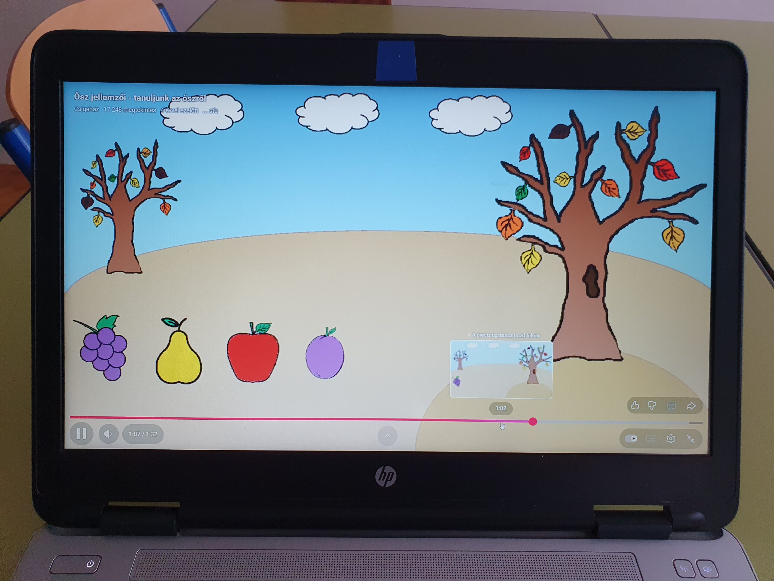Megnéztünk az őszről egy kisfilmet, majd az iskoláról készült fényképek bemutatása következett felismeréssel és egyeztetéssel: csoport, csoportszoba berendezése: asztalok, székek, polc, stb., udvar, tornaterem. A csoport közösen elkészített egy őszi háttérképet, melyre felragasztottuk az említett fényképeket. Végül az elkészült „művet” a faliújságra helyeztük.