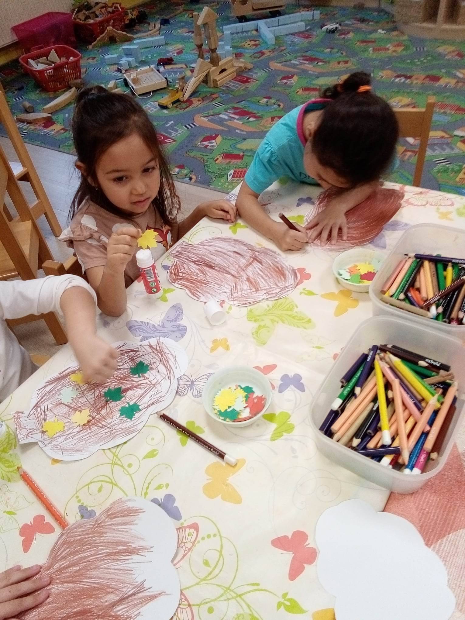 E havi foglalkozásunkon nagy hangsúlyt kapott az ősz, az őszi erdő. Különböző technikák felhasználásával készítettünk egy őszi erdőrészletet. Közös munka volt, különböző korú gyerekek együtt vagy egymás mellett differenciáltan tevékenykedtek. Szükség esetén segítettem őket a kivitelezésben, ötletadásban. A nagyobb gyerekek is szívesen segítenek kisebb társaiknak. Az ilyen „munka”, az együttes örömteli tevékenykedés jól egybefogja a közösséget, erősíti többek között a gyerekek szociális készségeit.