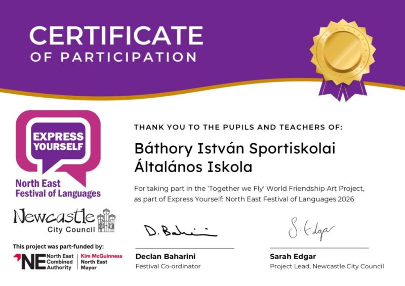 2026 elején, januártól egészen március 31-ig egy különleges nemzetközi művészeti programhoz csatlakozott a Báthory iskola 7.b osztálya. A „Together We Fly!” („Együtt repülünk!”) elnevezésű kezdeményezés célja az volt, hogy a világ különböző országaiban élő diákok alkotásaikon keresztül fejezzék ki összetartozásukat és barátságukat.