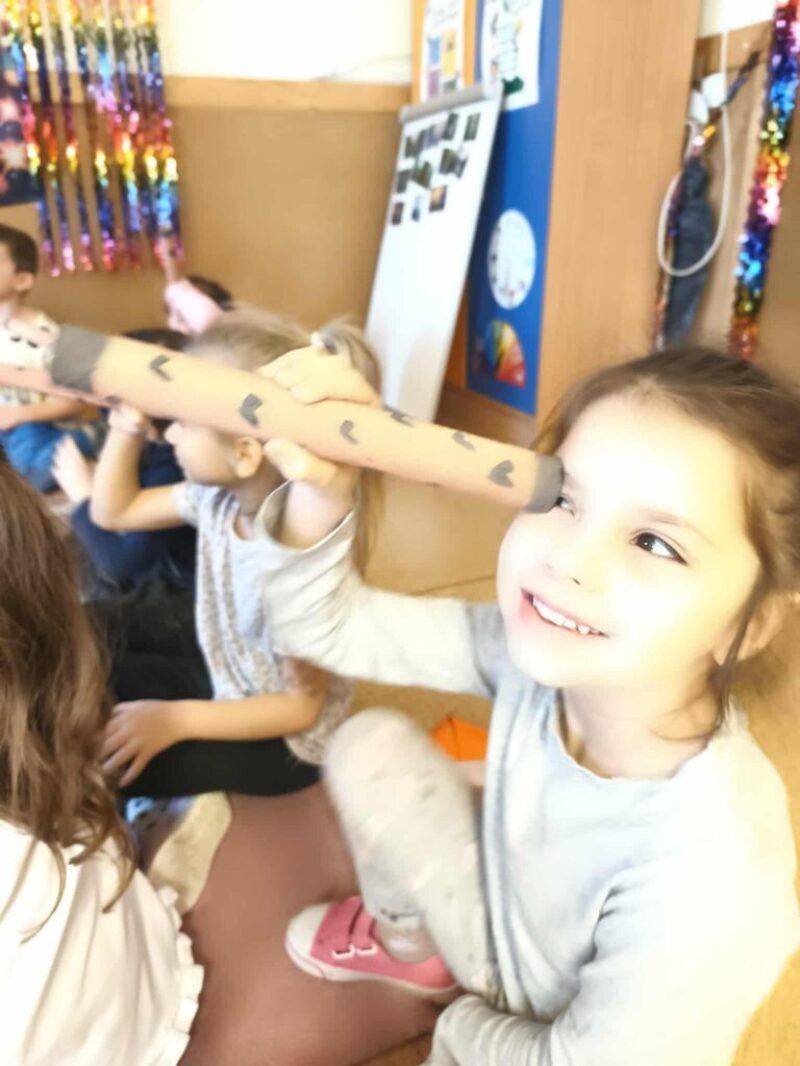 Az „Ötök szigetére” érkezve az öt érzékszervet ismételtük át, amely az érzékelés tudatosítását és a környezetre való figyelem irányítását szolgálta. A gyermekek saját varázscsákót készítettek, miközben én távcsövet készítettem számukra. Az alkotótevékenység során fejlődött finommotorikájuk, kitartásuk, feladattudatuk és esztétikai érzékük. A közös élmény erősítette az összetartozás érzését és a közösségi élményt.