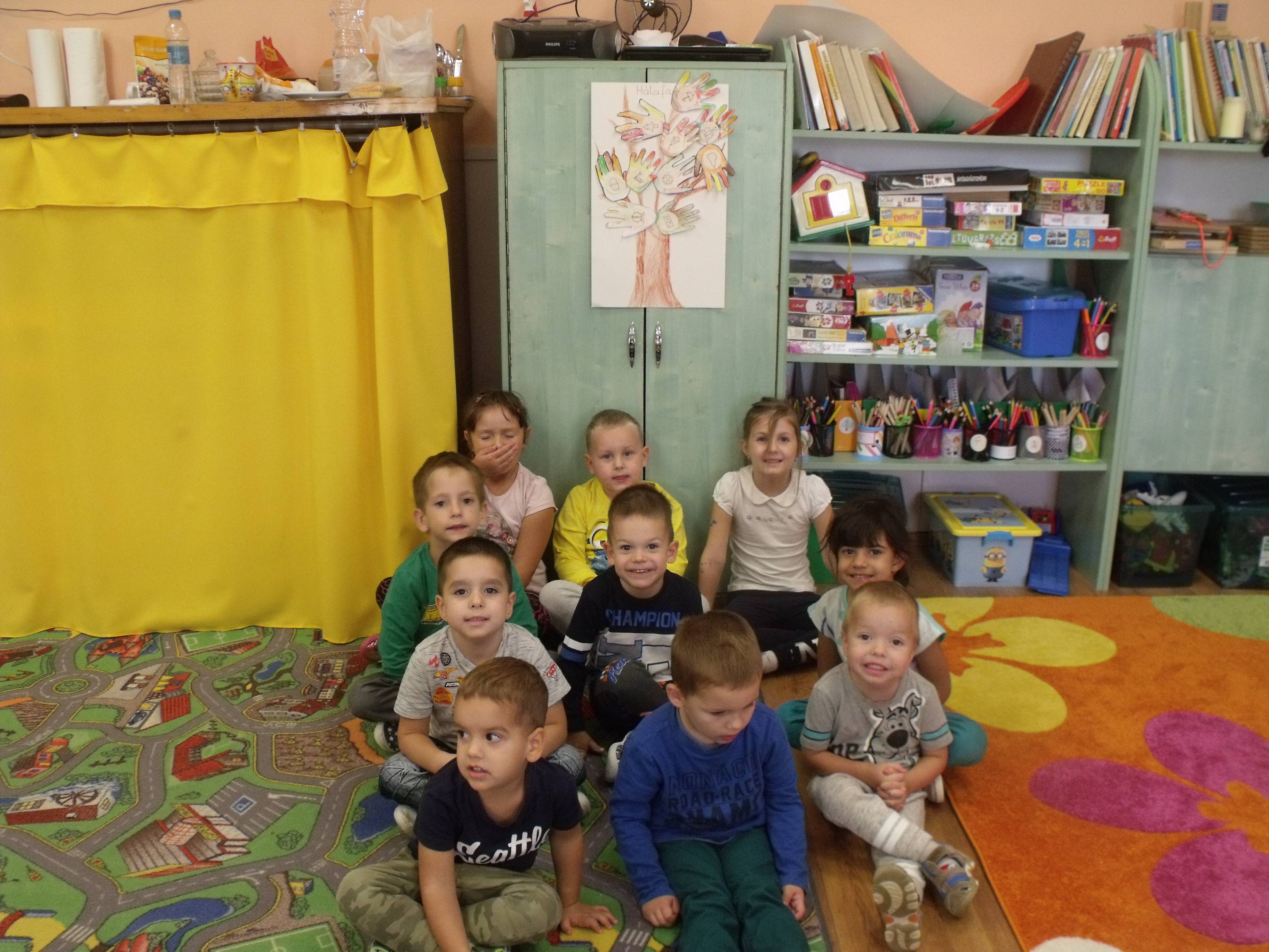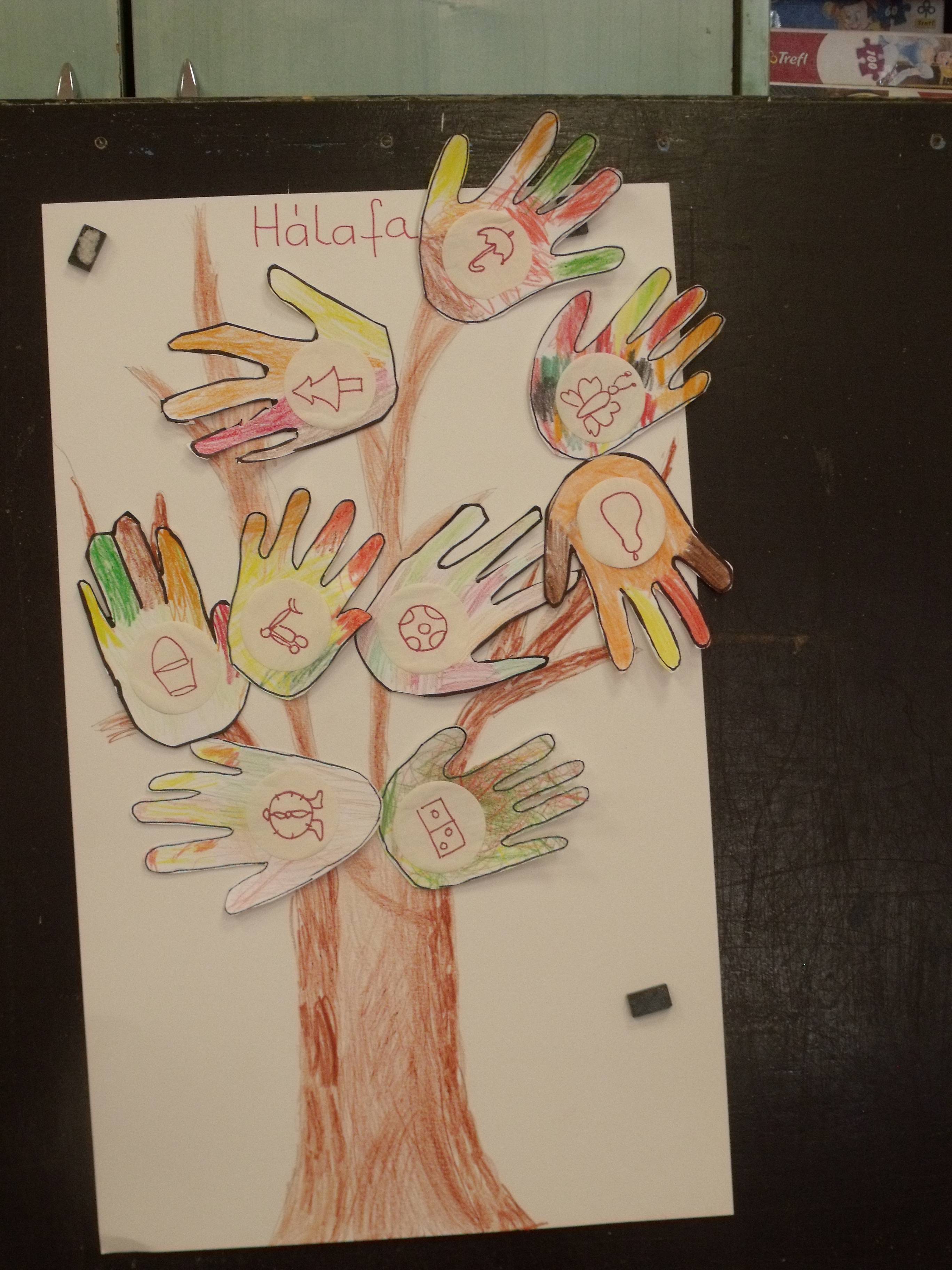 A csoportom vegyes csoport. Kis, középső, nagy. Úgy kezdtük a téma feldolgozását, hogy beszélgettünk a hála fogalmáról. A nagyoknak voltak okos meglátásai. / Hálás, hogy óvodába járhat, hálás, hogy anyukájával alhat, hálás, hogy az apukája haza megy és el jön érte az óvodába, hálás, hogy van étel az asztalon./Meghallgattuk a hónap zenéjét is. Először csak meghallgattuk, másodjára kértem, hogy figyeljék a szöveget, és együtt énekeljük. Még a kicsik is mondogatták a refrént. Eljátszottuk a leveles játékot is. Először egy levél, majd két levél, és utoljára három levél ment körbe. A játék vidáman hangulatban telt. Egy kisfiú homokozás közben talált egy falevelet. Fogta és azt mondta, hogy nekem adja. Kérdeztem, hogy miért? Válasz, mert szeretlek. Teljesen spontán történt. Az utolsó foglalkozás során a nagycsoportosok segítségével elkészült a Hálafa. A kezüket körberajzolták, színezték, kinyírták. A kicsik kezét körberajzoltam, ők színezték, én kinyírtam. Amikor feltették a fára a kis kezüket, mindenki elmondta, hogy miért hálás.