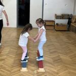 Páros játékokon keresztül mutattuk be, milyen együtt mozogni, együtt végigmenni egy akadálypályán, vagy megoldani egy feladatot. Érdekes kapcsolódásokat láttunk, attól függően milyen személyiségű gyermekek találtak egymásra. Ahol az egyik gyorsabb, dinamikusabb volt és párba állt egy lassabb, megfontoltabb gyermekkel érdekes mozgást és megoldást figyeltünk meg. Ahol két hasonló gyermek állt párba, láthattuk a nagyon jó közös dinamikát és problémamegoldást, együttműködést.