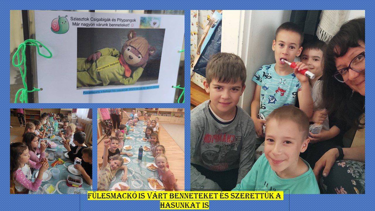 Hálát adtunk azért, hogy jó csapatként értünk a negyedik év végére, sok barátság született, és sok folytatódik az iskolában, vagy azon kívül. Hálásak vagyunk minden boldog percért, amit együtt tölthettünk a gyerekekkel. Optimistán nézünk a leendő hónapok, iskolai évek elé, és már vártuk nagyon az évzáró pizsamapartynkat. Sok-sok izgalomban volt részünk, melynek emlékét őrizzük, dédelgetjük és kacagva emlegetjük, a barátságokat pedig ápoljuk nemcsak a gyerekek, szülők is egymás között. Ahol tudunk, segítünk, hiszen itt van a nyári összevonás, több csoport ilyenkor összevonásra kerül és mi negyedik éves nagycsoportosok, már mások segítségére lehetünk! Vannak céljaink, álmaink a nyárra vonatkozóan és az iskolakezdésről is sokat beszélünk. Tudjuk, hogy ezek a hónapok sem lesznek akadálymentesek, de törekszünk mindennek a jó oldalát nézni és törekedni a céljaink elérésére. Biztosan lesznek duzzogások, viták, összezörrenések társainkkal, szüleinkkel, de tanultunk szépen bocsánatot kérni, képesek vagyunk már a megbocsátásra, engesztelő szavak kimondására. Egyre többet mozgunk, ilyenkor csúcsosodnak ki eredményeink, az évvégi foci-és kézilabdameccsek, vagy épp egy futóverseny kapcsán. Sokat mozgunk, sokat vagyunk már az udvaron, és a családtagokkal is egyre több alkalmunk van kikapcsolódni, kirándulni. Hogy ezt az évet boldogan zárjuk, ovisainknak a Pitypangos boldogságórás csoporttal és Éva nénivel, Kati nénivel, Ildikó nénivel pizsama partyt szerveztünk a ballagó kis boldogovisainknak. Fenntartható boldogság volt a javából, volt ebben hála, mert ilyet még sosem éltünk meg az óvodában, hogy éjszaka is bent aludjunk, optimizmus, mert bizakodón álltunk eme élmény megvalósításához, társas kapcsolatok is alakultak a másik csoporttal, és számos jócselekedetről is számot adhatunk, hogy milyen volt amikor az éjszakai kincskeresésben segítettük a félősebb lányokat. Céljaink is voltak, ki gyűjti a legtöbb kincset, és küzdöttünk a többi csapattal itt, az udvaron és a reggeli torna során a csapatjátékokban. A párnacsata alkalmat adott a bocsánatkérésre is, amikor sikerült valakit úgy eltalálni és mozogtunk sokat a lufis tánc, pizsidizsi, torna kapcsán. Reggeli ébresztőnél gitárral ébresztettem a gyermekeket és amikor beszélgettünk, rengeteg jó élményt fel tudtak sorolni, mi volt a jó az éjszakai bennalvásban, szervezett programokban.