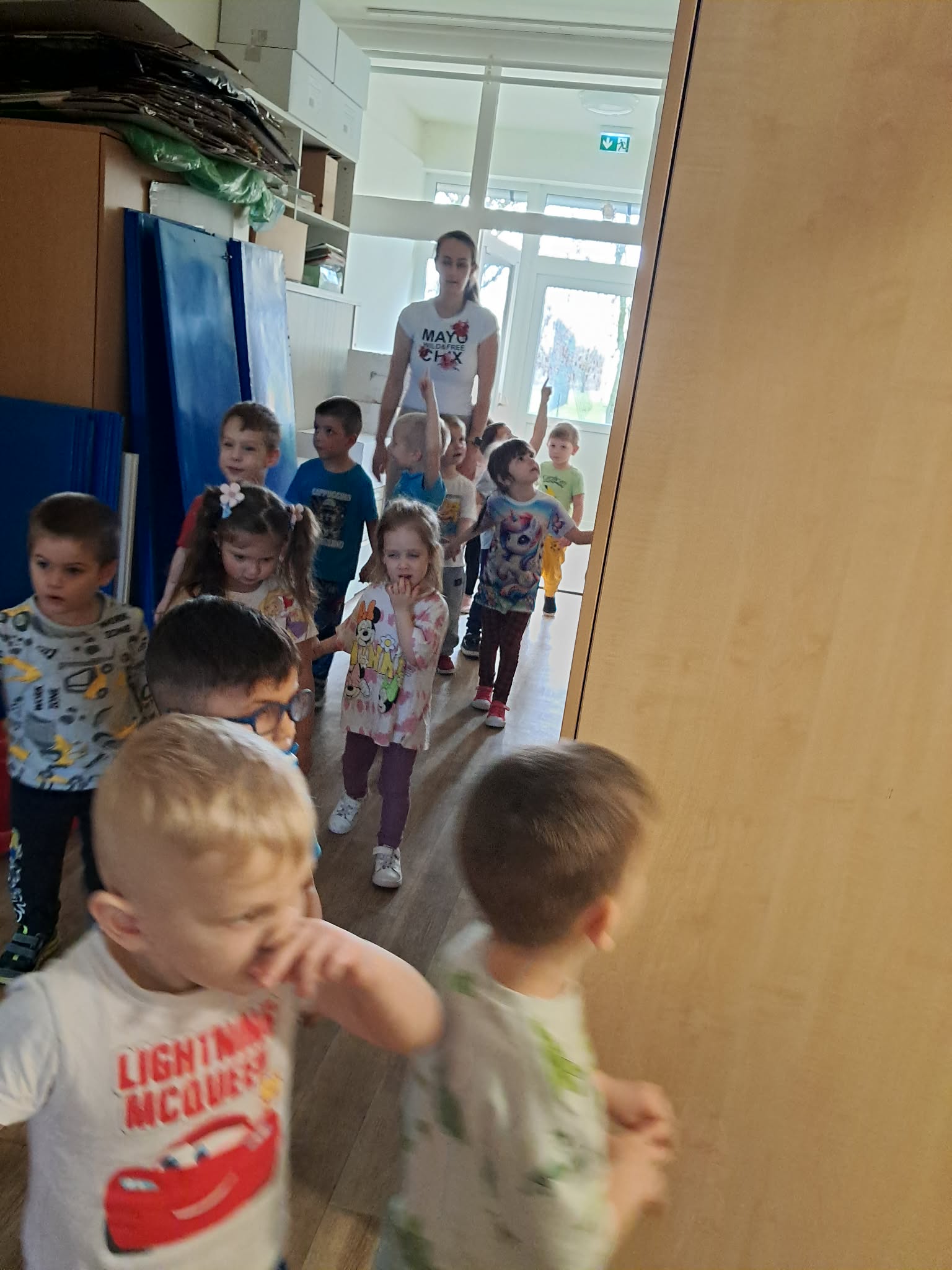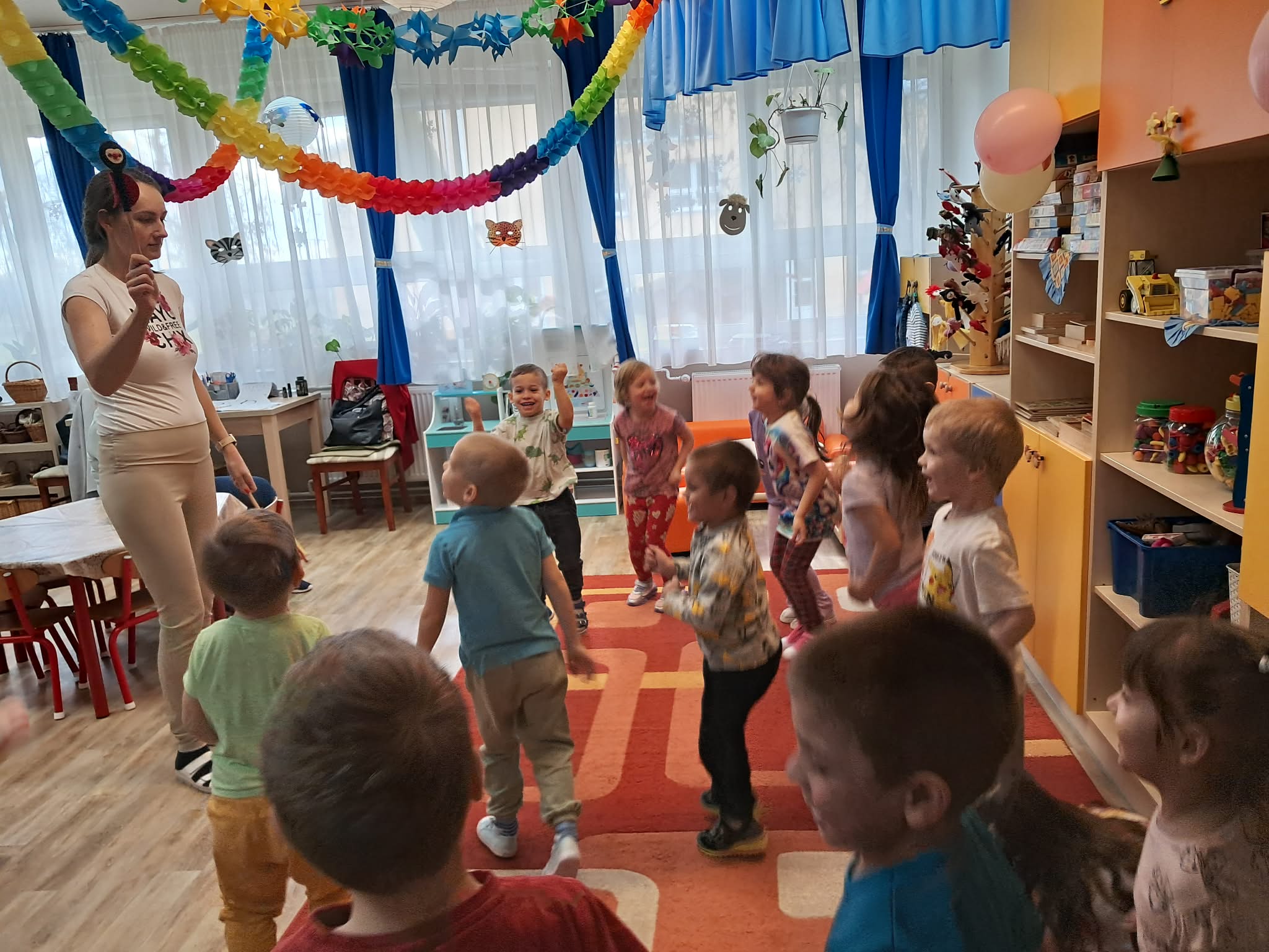 A gyerekek tornáztak, verset mondtak, énekeltek, keresgéltek az óvodai folyosón a játékok után, majd mikor visszaérkeztek a csoportba, meglátták az elrejtett játékokat a helyükön.