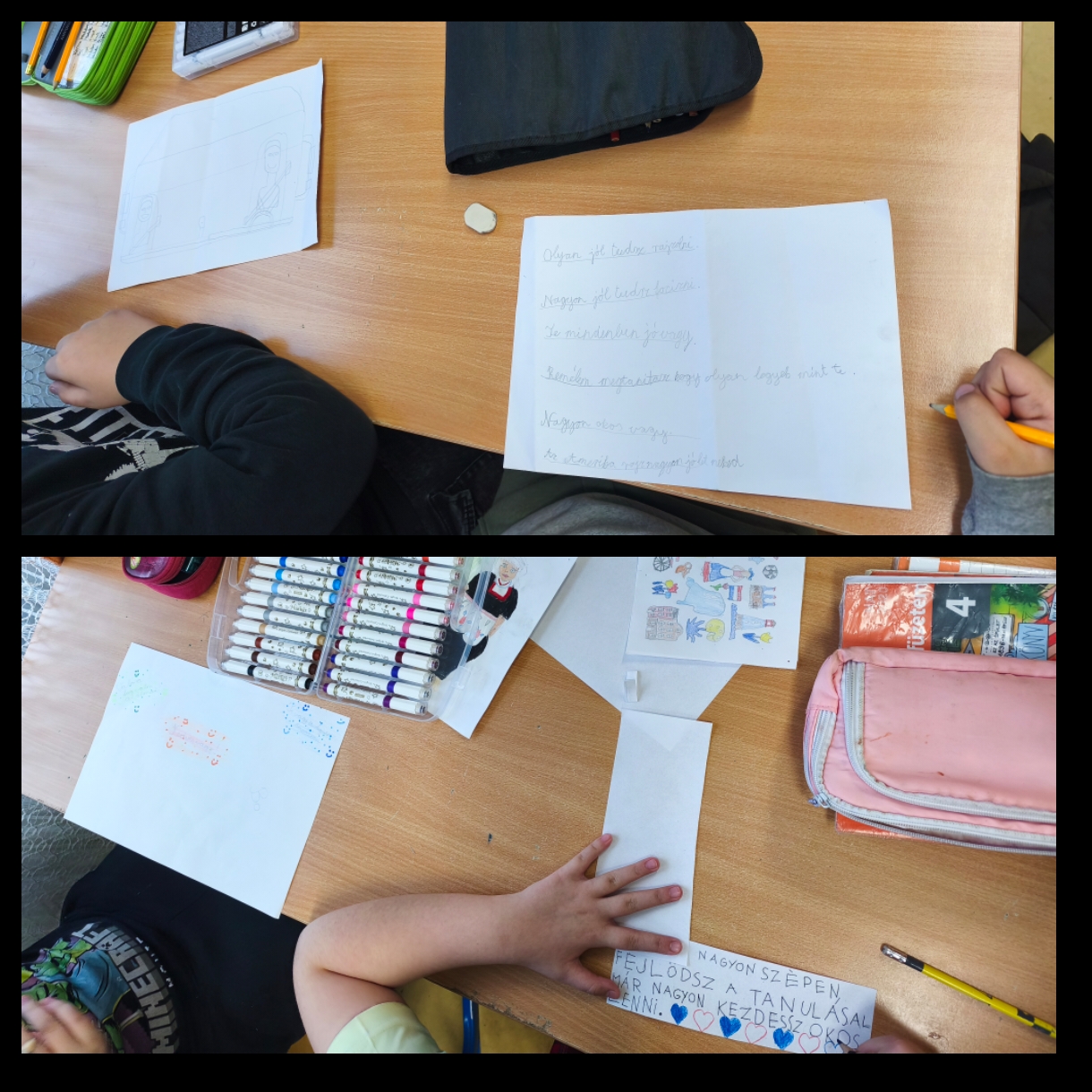 A Pozitív ajándék játékhoz egymás nevét kihúzták a gyerekek, titokban tartották egymás előtt, ki kit húzott. Egymásnak készítettek rajzot, levelet stb. Az volt a cél, hogy pozitív és bíztató dolgot készítsenek egymásnak. Volt, aki szerette volna átadni személyesen, volt, aki titokban csempészte oda az ajándékát. Nagyon izgatottan készítették és várták az ajándékot.