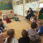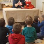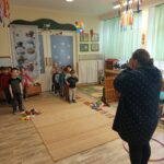 Játék után Boldog Dóra szélcsengőjével és mesébe hívó mondókájával mesehallgatásra hívta a gyerekeket. Elmeséltem A Didergő király című mesét. Azután beszélgettünk arról, hogy a kislánynak, mekkora célt kellett kitűznie, hogy elérje a királynál, hogy ne fázzon. Kértem őket, hogy sorolják el nekem, hogy milyen dolgok kellett ahhoz, hogy a kislány célja megvalósult (bátorság, önismeret…)