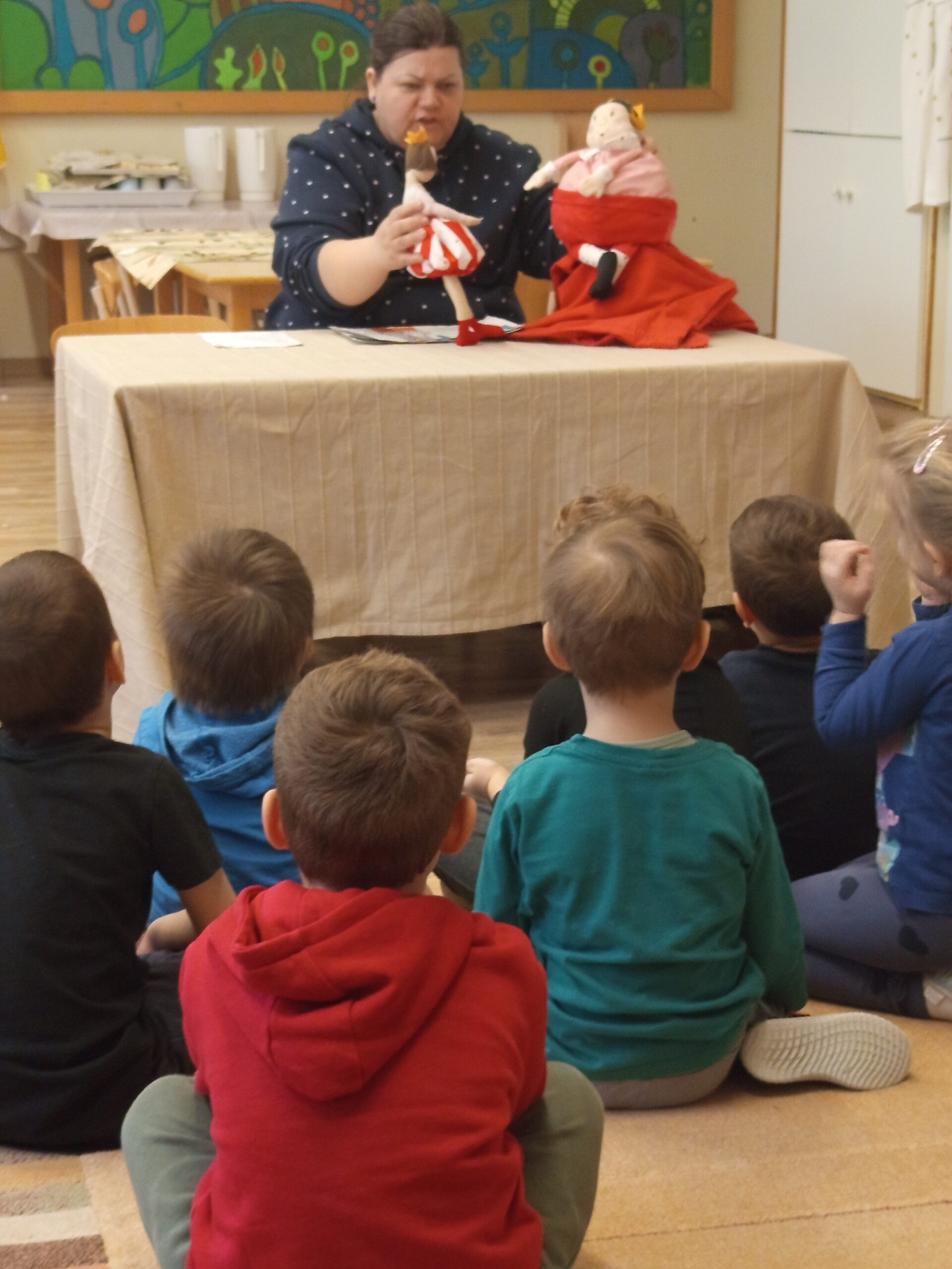 Játék után Boldog Dóra szélcsengőjével és mesébe hívó mondókájával mesehallgatásra hívta a gyerekeket. Elmeséltem A Didergő király című mesét. Azután beszélgettünk arról, hogy a kislánynak, mekkora célt kellett kitűznie, hogy elérje a királynál, hogy ne fázzon. Kértem őket, hogy sorolják el nekem, hogy milyen dolgok kellett ahhoz, hogy a kislány célja megvalósult (bátorság, önismeret…)