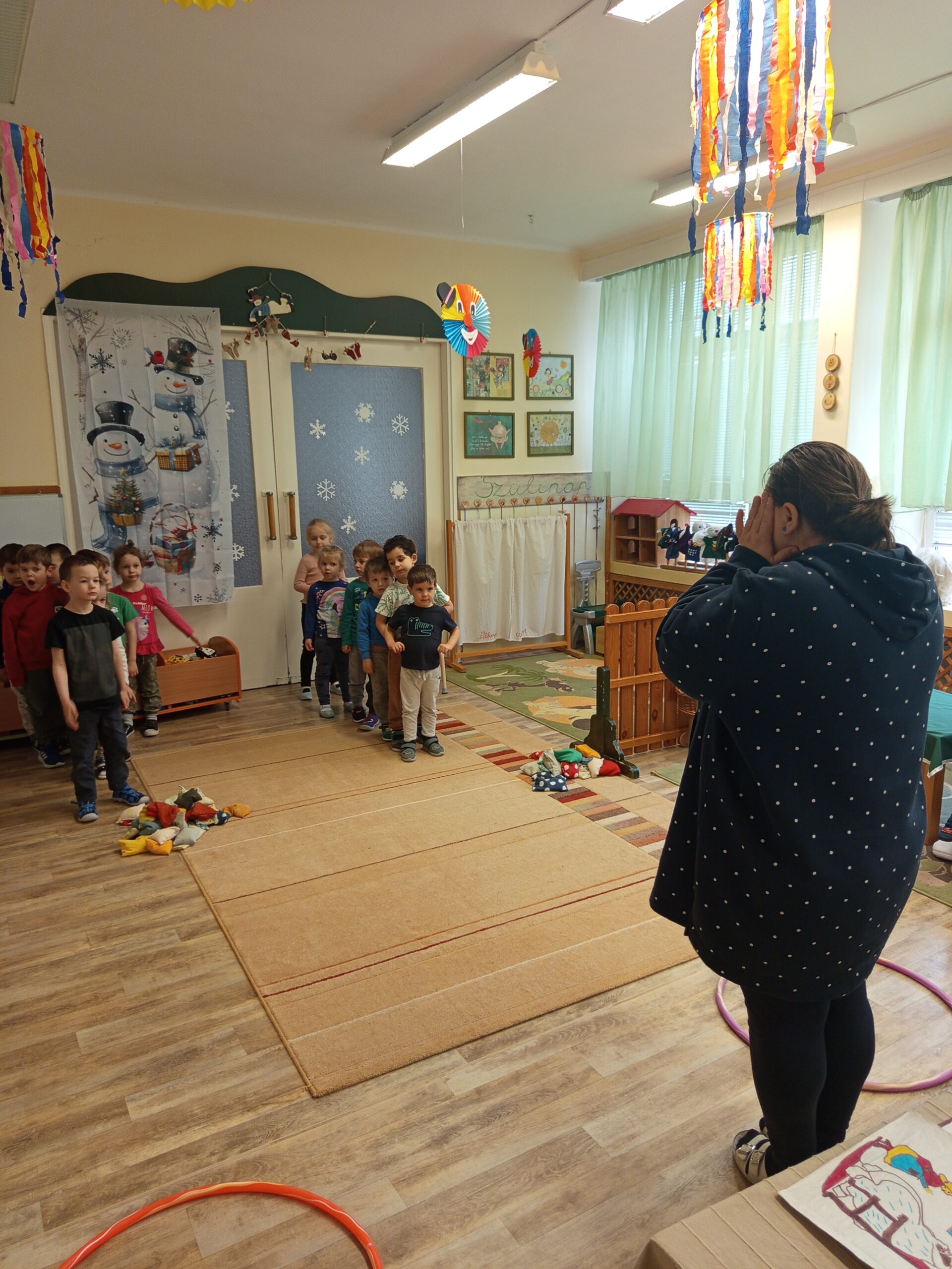 Boldog Dóra új évet kívánt a gyermekeknek, hiszen ebben az évben még most találkoztak először. A gyerekek egy köszöntő verssel fogadták őt, majd párban állva, a végén egymást átölelve is bemutatták újonnan tanult versüket.