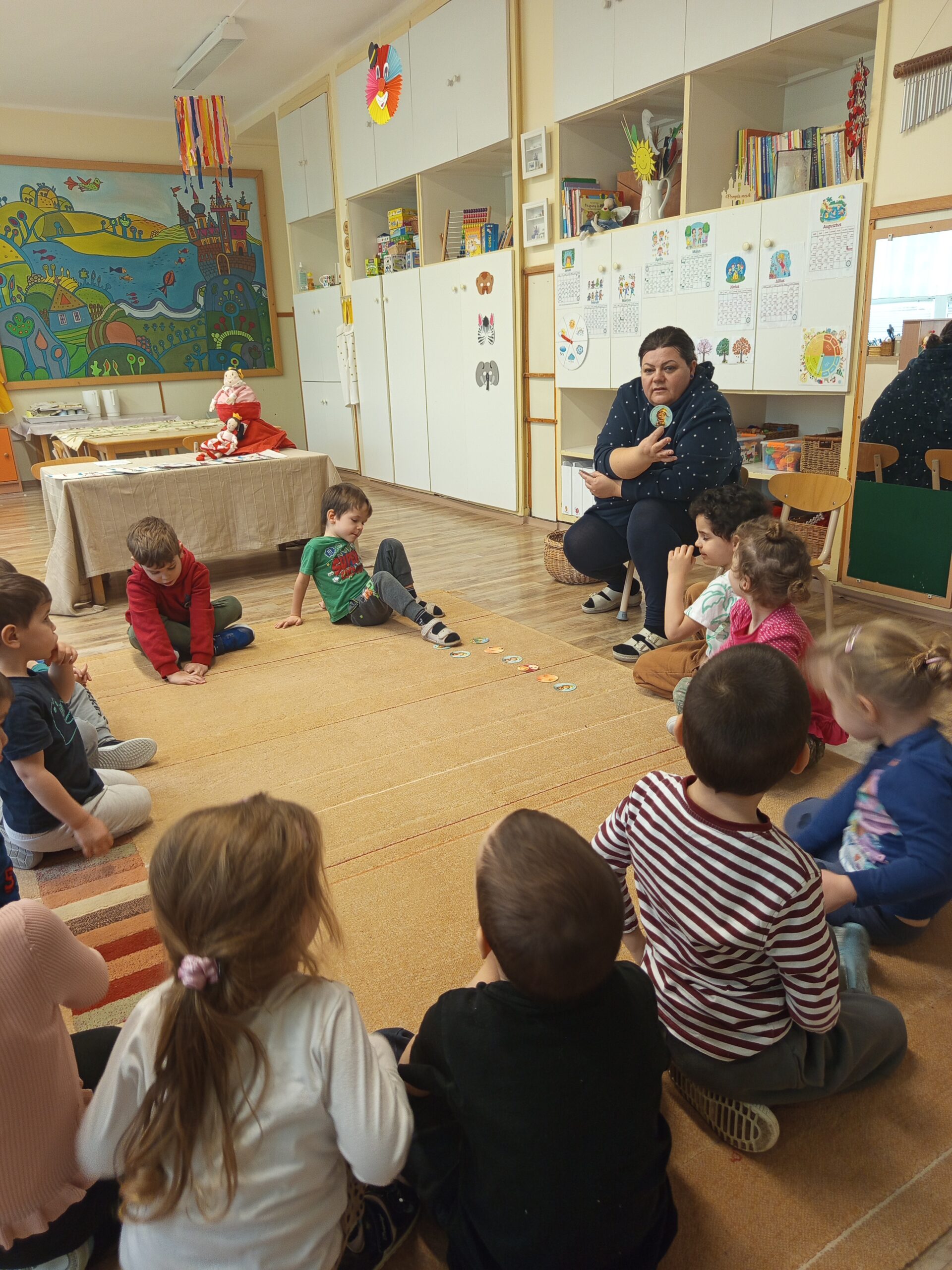 Majd a Boldogság mondókával mentünk vissza a nagy szőnyeghez, ahol Bagdi Bella: Van nekem egy álmom című dalára táncoltunk a gyerekekkel. Boldogan, vidáman, felszabadultan énekelték a dalt táncolás közben.