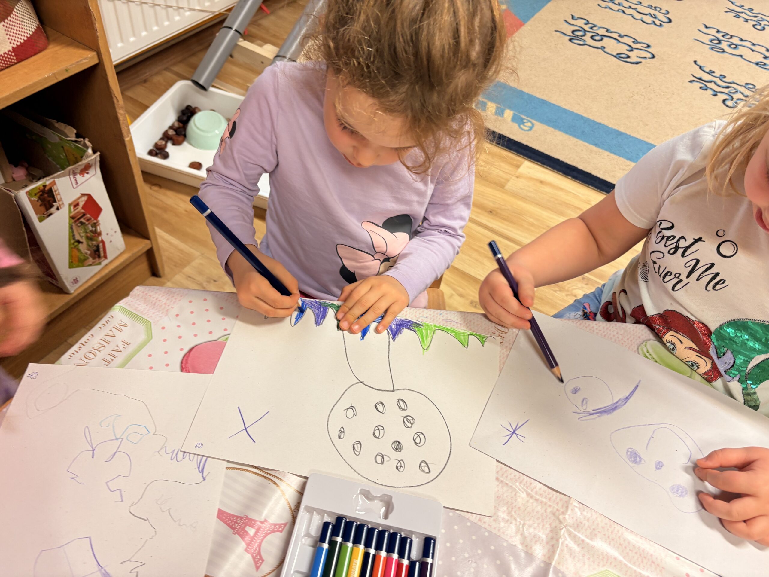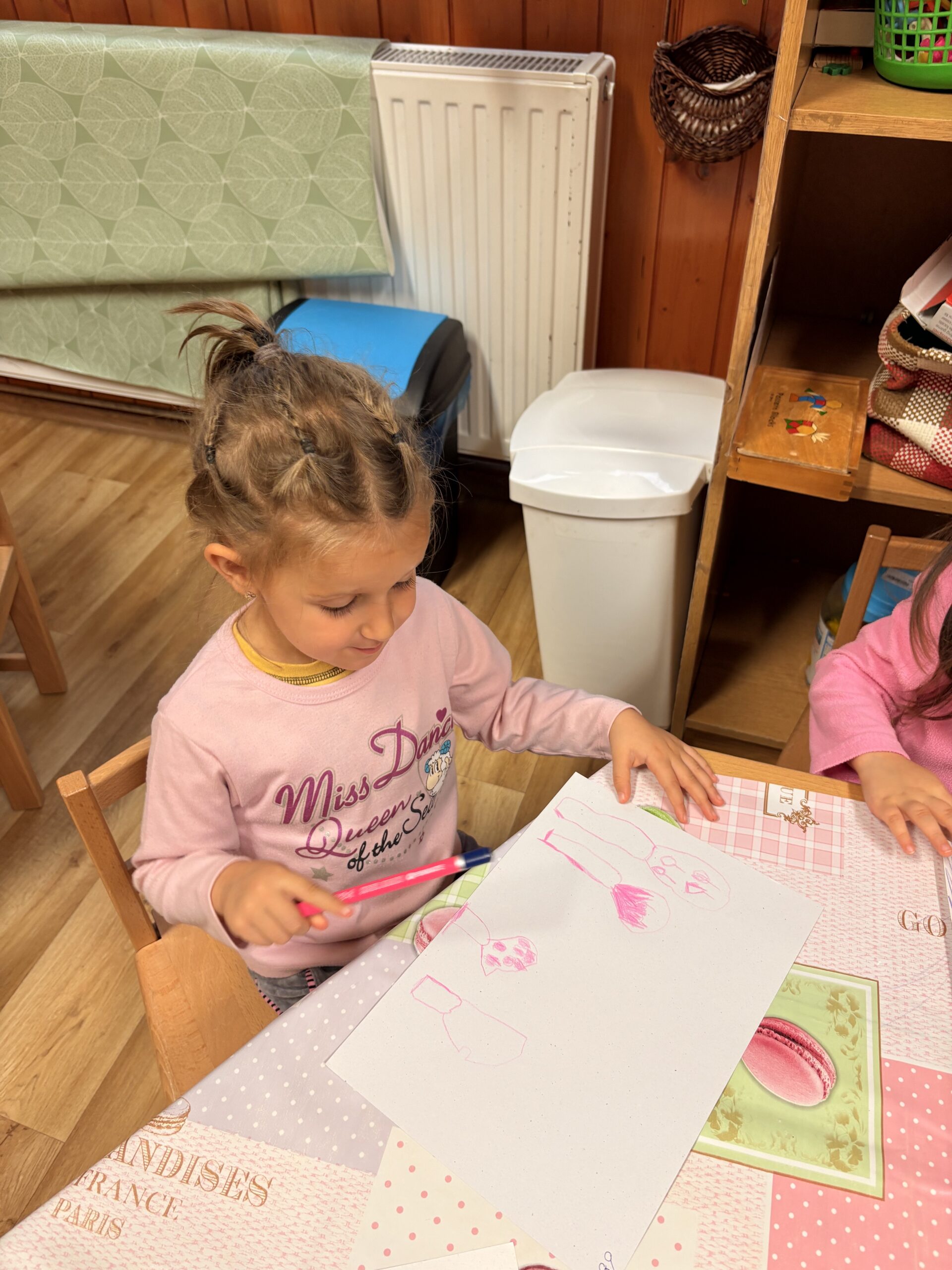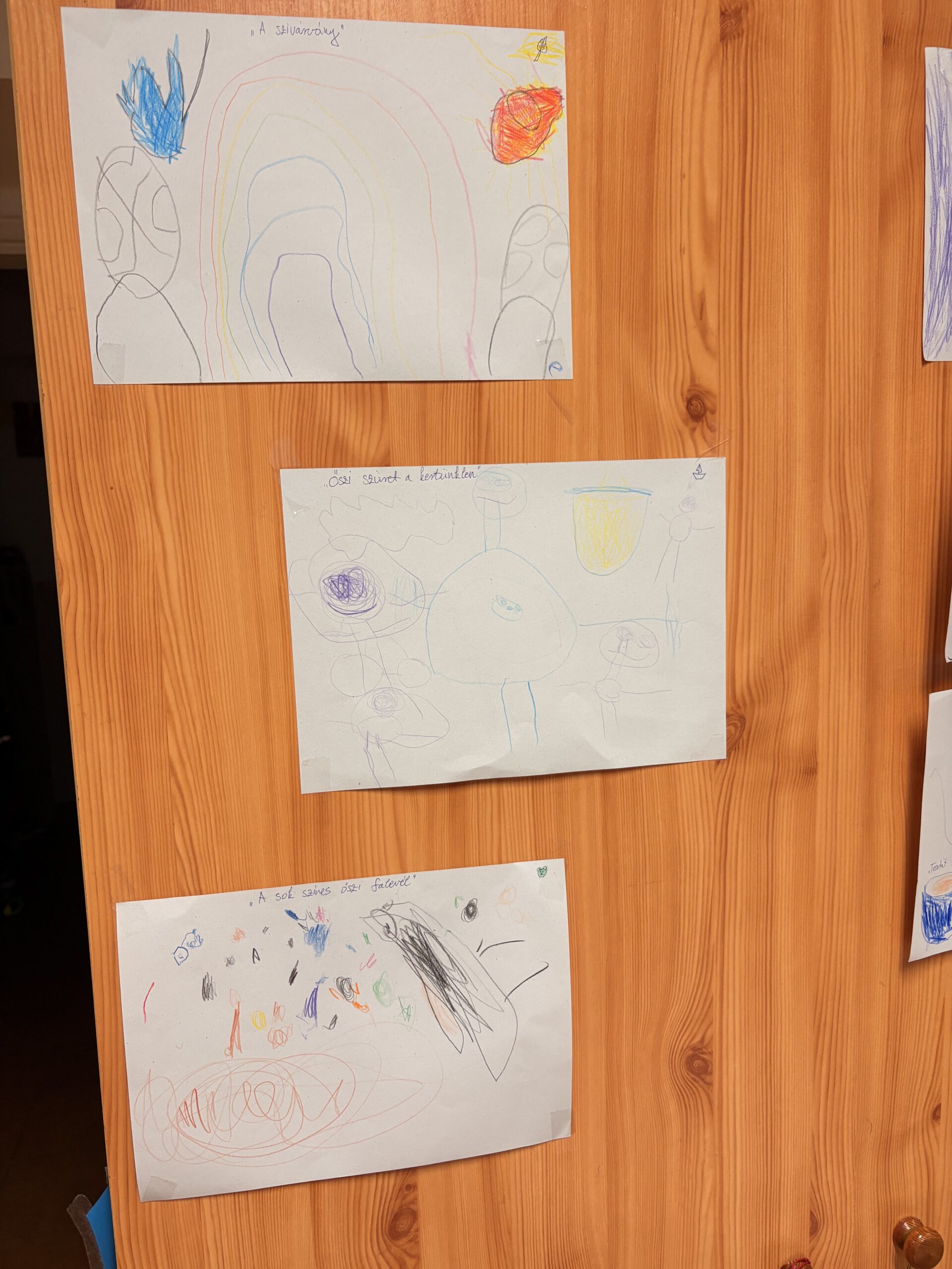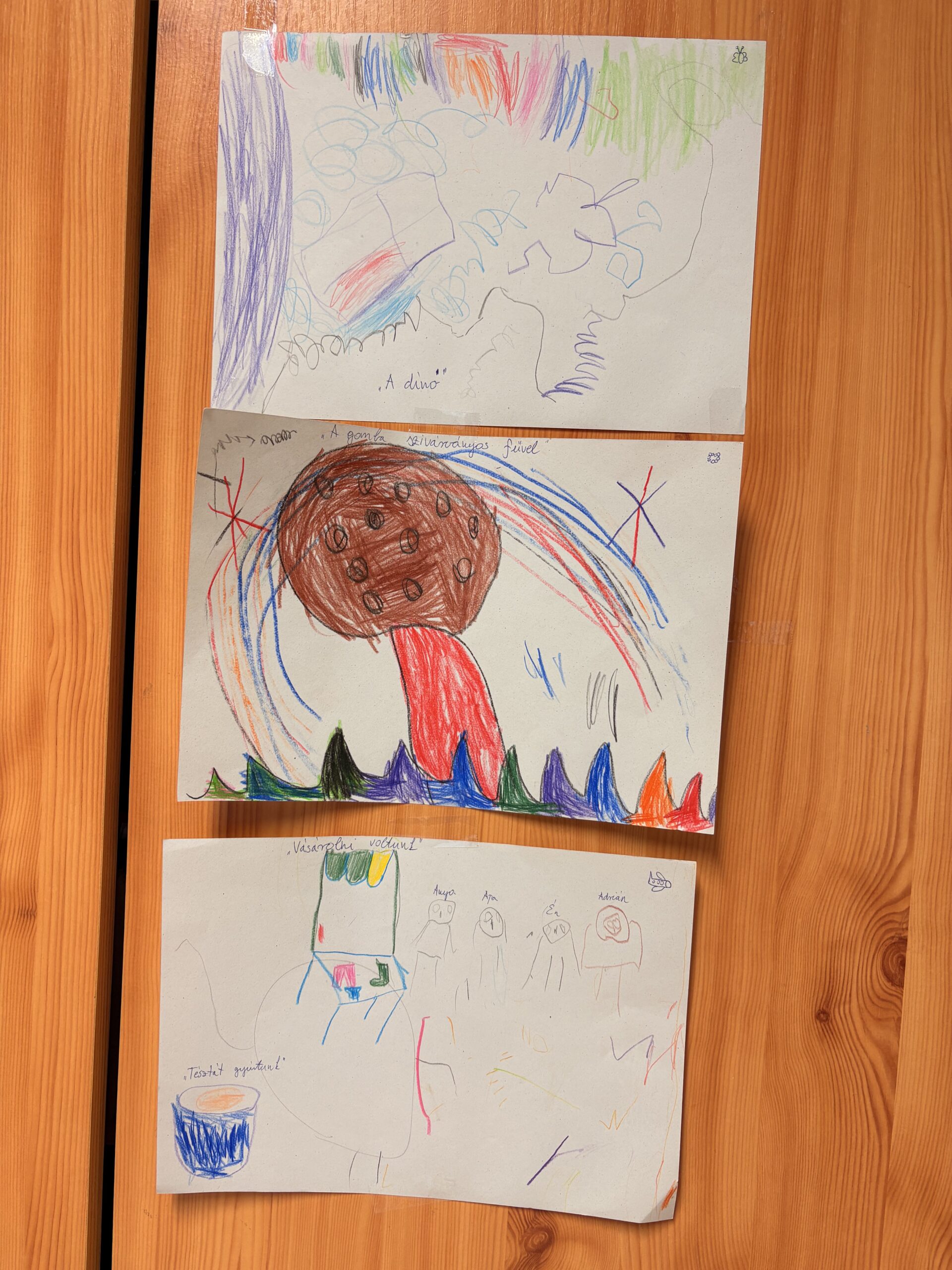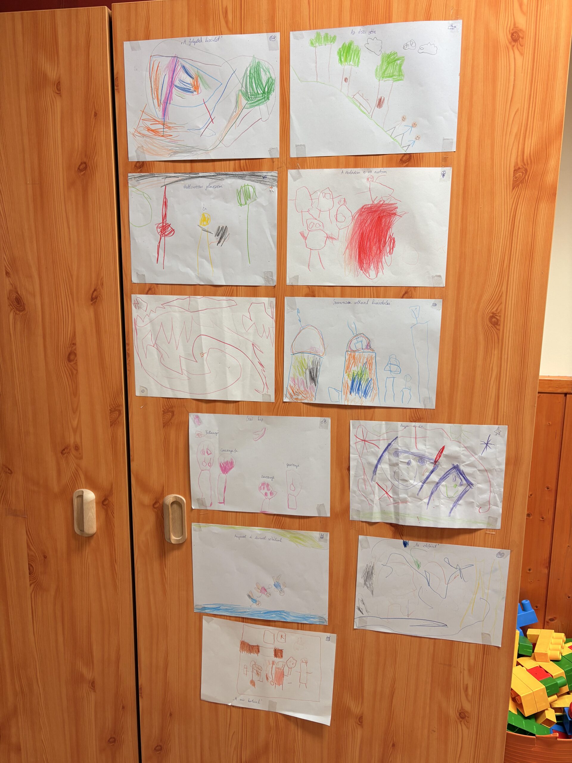 A Boldogságóra program keretében a gyermekekkel „Az apró öröm az életben” című témát dolgoztuk fel. A foglalkozás során szabad asszociáció alapján rajzoltak, miután közösen beszélgettünk arról, mi minden okozhat örömet a mindennapokban. A gyerekek rajzai leggyakrabban az őszi szünetben átélt élményeiket jelenítették meg – családi kirándulásokat, közös játékokat és vidám pillanatokat. A tevékenység segítette őket abban, hogy tudatosítsák és megosszák egymással az élet apró örömeit.