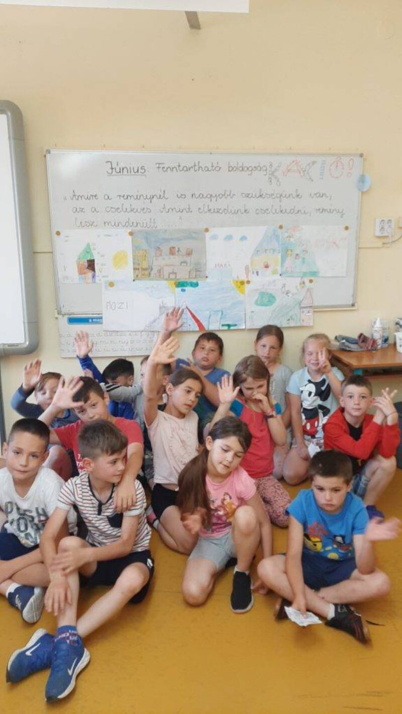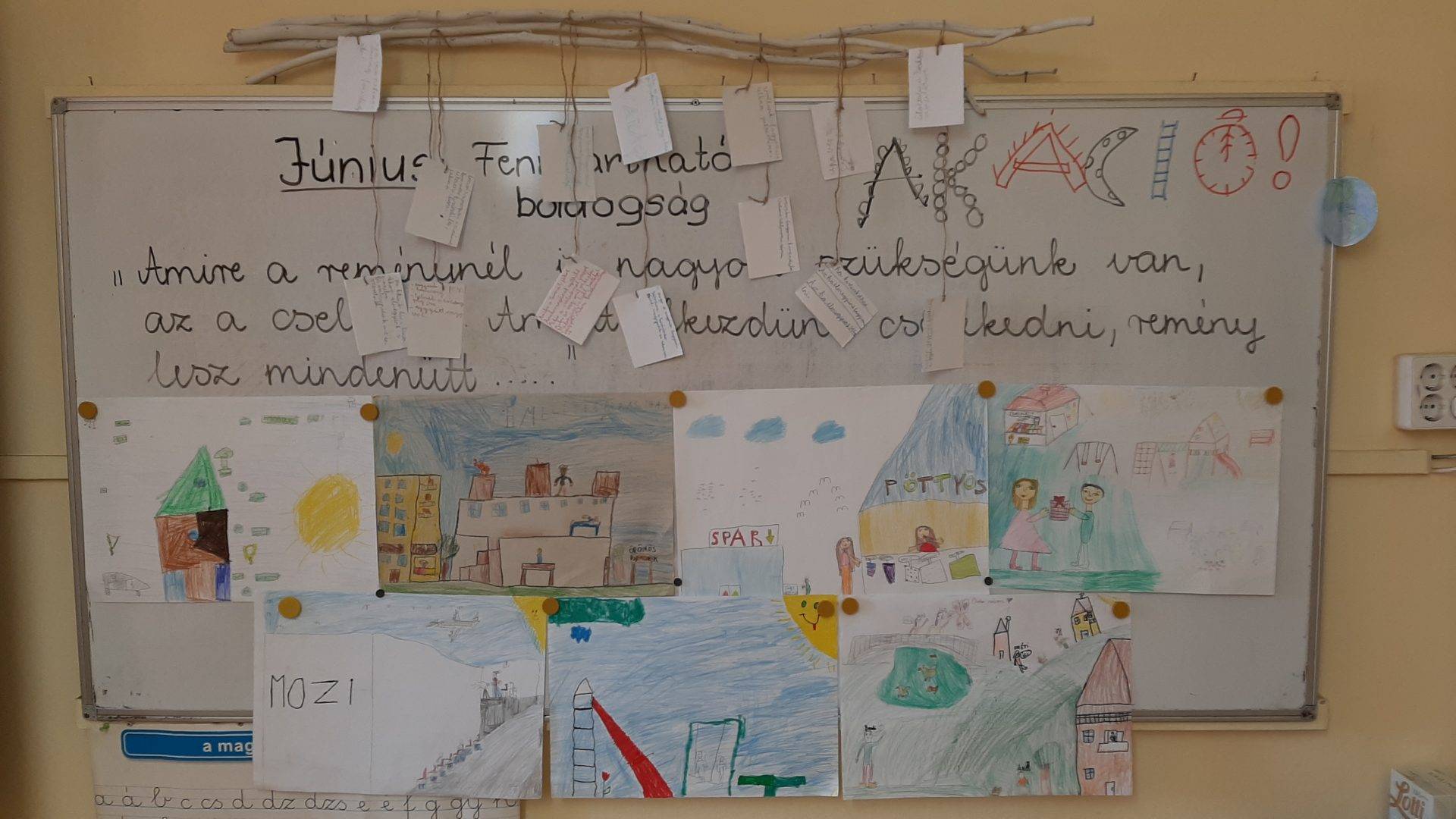 Mottó: „Amire a reménynél is nagyobb szükségünk van, az a cselekvés..” Az órát most is az ajánlott zenével kezdtük. A ráhangolódás beszélgetéssel folytatódott. Megbeszéltük, hogyan tudunk a boldogságszintünkön emelni és hogyan tudjuk fenntartani azt. Megbeszéltük, hogy mennyi pozitív energiát szabadít fel a cselekvés, az ha azt tehetjük, amit szeretnénk, ha van hobbink, ha ápoljuk társas kapcsolatainkat. Ezután a gyerekek kis papírokra felírták, hogy mi okoz nekik örömöt akár az életükben, akár a boldogságórákon és gallyakat összekötözve, a kis cetliket felkötözve, elkészítettük a mi örömfánkat-gallyunkat. A második órában pedig páros munkában „Örömváros” címmel elkészültek a gyerekek képzeletében megszületett városok, amikben a pozitivitás, boldogság, öröm a legfontosabb, talán egyetlen jellemző. Az órák szuper év végi hangulatban teltek. Köszönjük a sok ötletet, lehetőséget! Jövőre ismét csatlakozunk a programhoz!