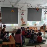 Ezután babzsákokból meseösvényt építettünk, és sorban mindenki végigsétált a kacskaringós ösvényen. Eljutottunk Meseországba, ahol papírszínház mesét láthattak, hallhattak a gyerekek. A mese címe: Jégország királya.