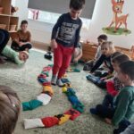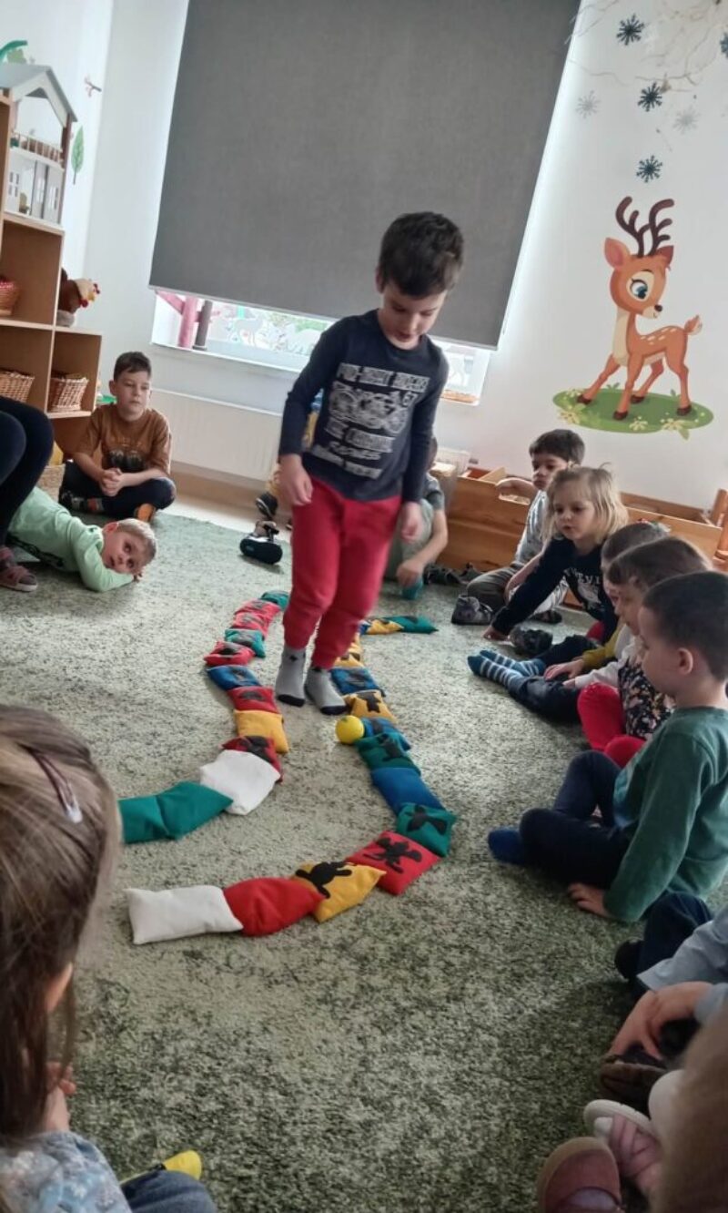 Ezután babzsákokból meseösvényt építettünk, és sorban mindenki végigsétált a kacskaringós ösvényen. Eljutottunk Meseországba, ahol papírszínház mesét láthattak, hallhattak a gyerekek. A mese címe: Jégország királya.