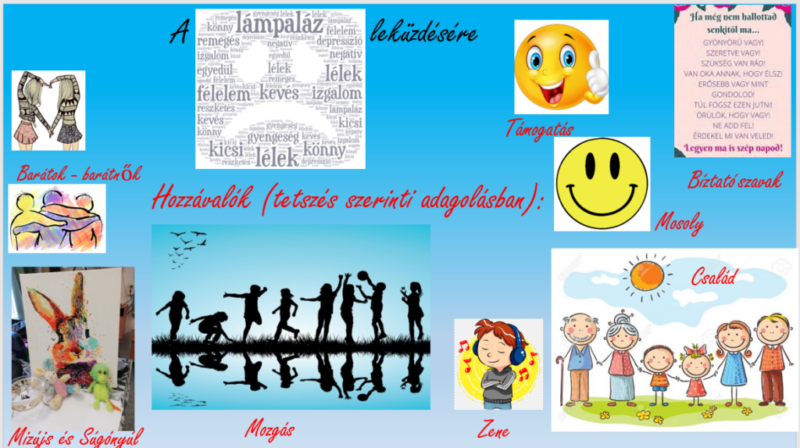 A bevezető beszélgetés témáját a mindennapok feszült helyzetei adták, majd rákanyarodtunk a lámpaláz kifejezésre. A gyerekek ötletei alapján elkészült a szófelhő, melyben a szóhoz kapcsolódó fogalmakat írtuk be. Személyes élményeket is felelevenítettek, mikor segítette és mikor hátráltatta őket a lámpaláz egy adott helyzetben. Végül megalkottuk a receptet, amelynek hozzávalóit ők javasolták.