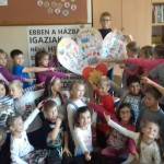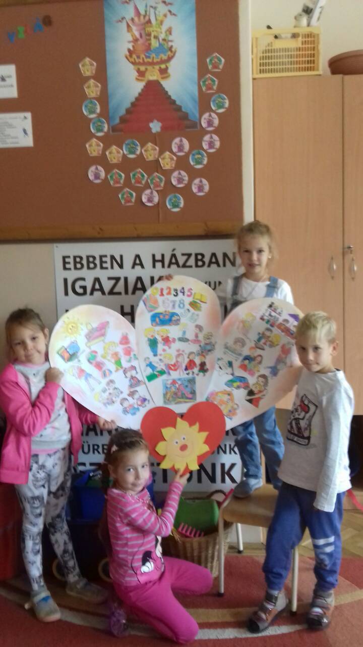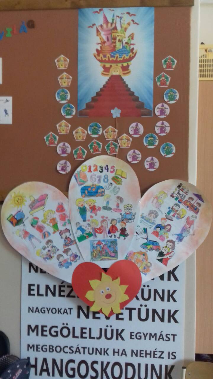 Mi, még csak most ismerkedünk egymással, a sulival, a tanítási órákkal, a betűkkel és a számokkal. Elsősök vagyunk, és év végére szeretnénk eljutni a Boldogság várába, aminek 10 tornya van, és 10 lépcsőfok vezet arany kapujához a boldogságfokozó technikákat jelölve. Már az első lépcsőfokra fel is került a hála virága, amit a Kerekerdő tündéreitől kaptunk. A tündérek meséjéből megtanultuk, hogy a hála, a szeretet és a jó szó elűzi a szomorúságot, meggyógyítja a beteg lelket. A rosszkedv elűző dalocskával még vidámabbak lettünk, és a szeretetgombócunk töltelékét jól megölelgettük.