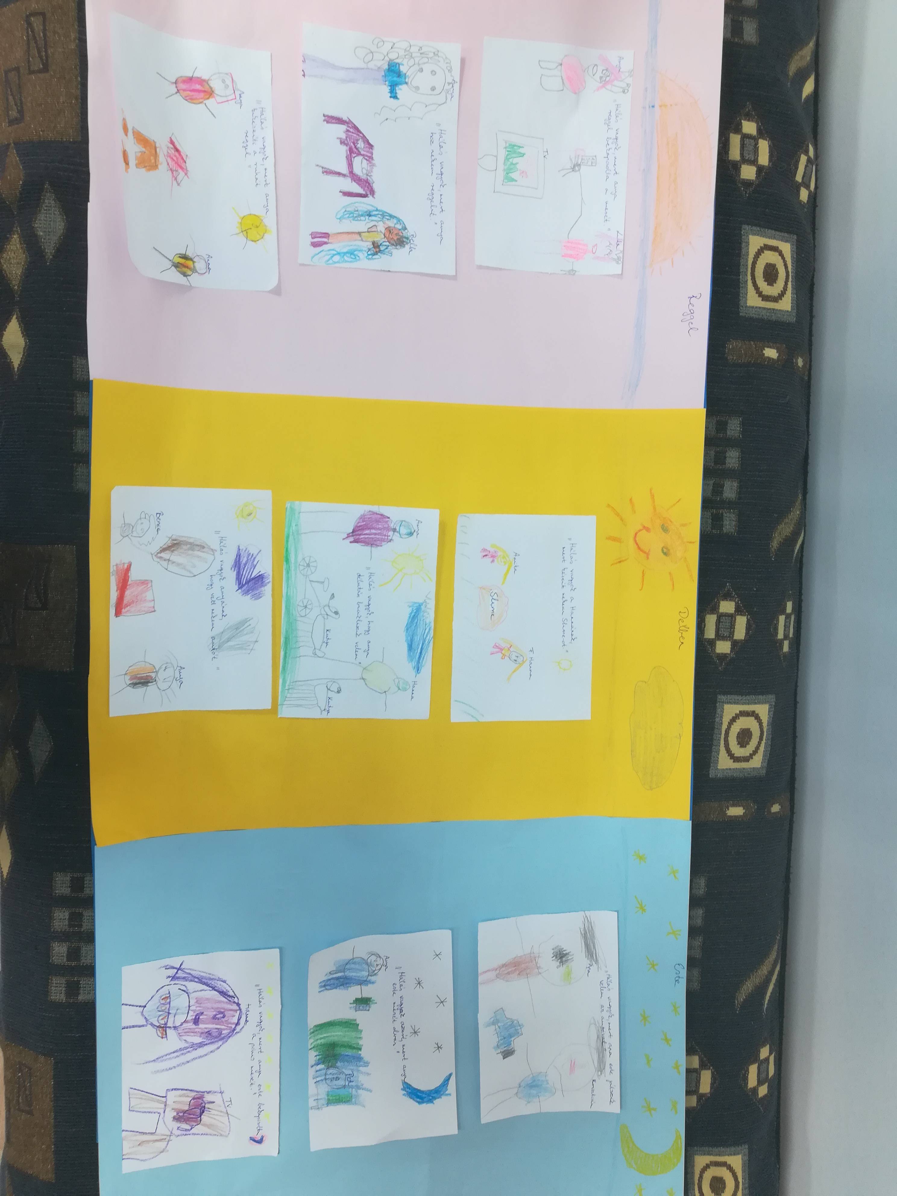 A Lepke csoportosokkal a héten a Hála témakörrel foglalkoztunk. Először megbeszéltük, hogy mit is jelent a Hála szó számukra. Majd kifejezhették szóban is társaiknak, hogy miért hálásak nekik: ,, Hálás vagyok, mert odaadtad a játékodat, mert játszottál velem, mert segítettél elpakolni! ” A hét zárásként készítettünk egy plakátot, ahol napszakokra bontva rajzolhatták le a gyermekek, hogy szüleiknek, pajtásaiknak miért hálásak. Ezeket a rajzokat aztán csoportosan is megtekintettük, megbeszéltük és közösen felragasztottuk a plakátra. Javasoltam nekik, hogy hálájukat akár egy kedves kis rajzzal, ajándékkal is kifejezhetik szüleik, pajtásaik felé.