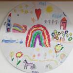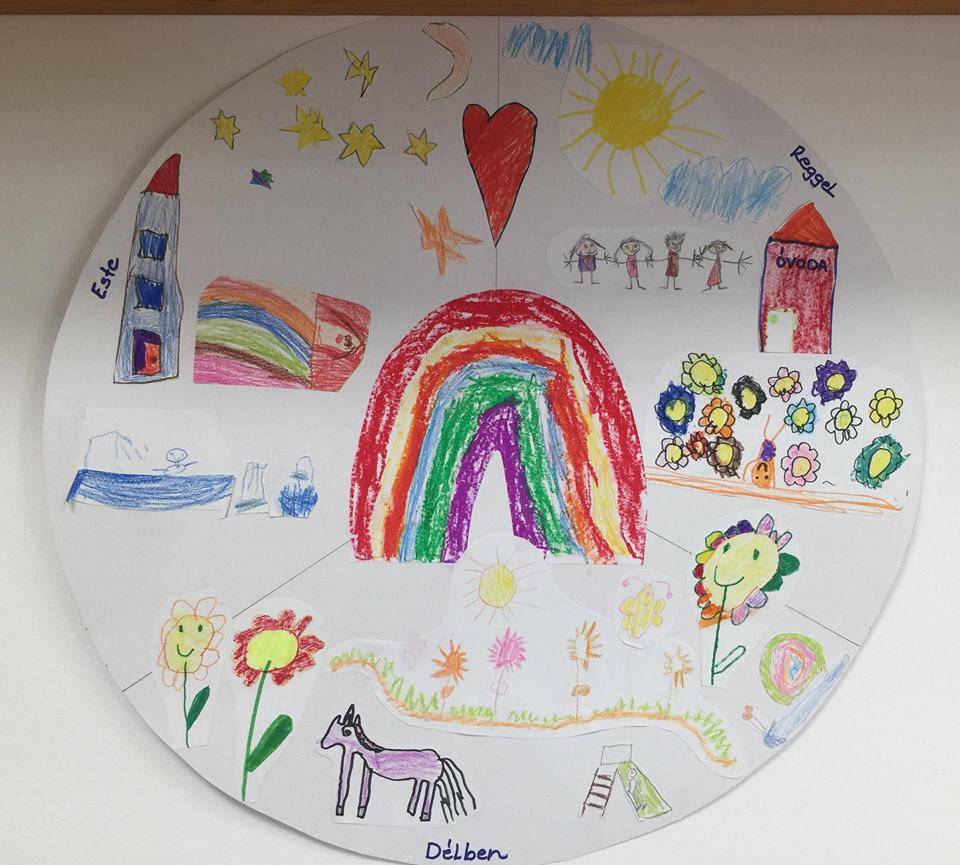A hónap zenéje nagyon tetszett mindenkinek, segített ezt a nehéz fogalmat érthetőbbé varázsolni számukra. Beszélgetőkörök keretén belül elmondhatták érzéseiket, amit utána le is rajzolhattak. Ezekből a rajzokból, közösen készítettük ezt a montázsát: “Reggel, délben, este”.