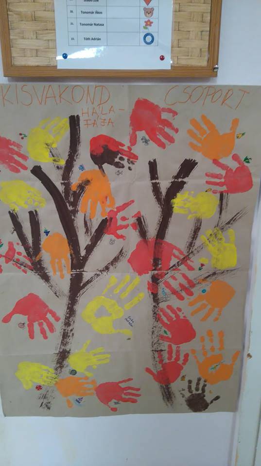 Figyelemfelhívásként, kapott a Kisvakond csoport egy levelet, melyben az állt, hogy a Kerekerdő közepén áll egy Fa, ki nagyon magányos. Hálás lenne, ha az Ősz-manók, -azaz a gyermekek- szólnának az őszi faleveleknek, hogy látogassák meg Őt. Ehhez varázslatra van szükség. Így tenyérlenyomattal, az ősz színeit (tempera-festék) és a gyermekek előzetes ismereteit felelevenítve varázsoltuk varázspálcáinkkal (ecsettel) az őszi faleveleket a Fára, aki végül nagyon hálás volt -a Manóknak azt üzente-, így már nem magányos.